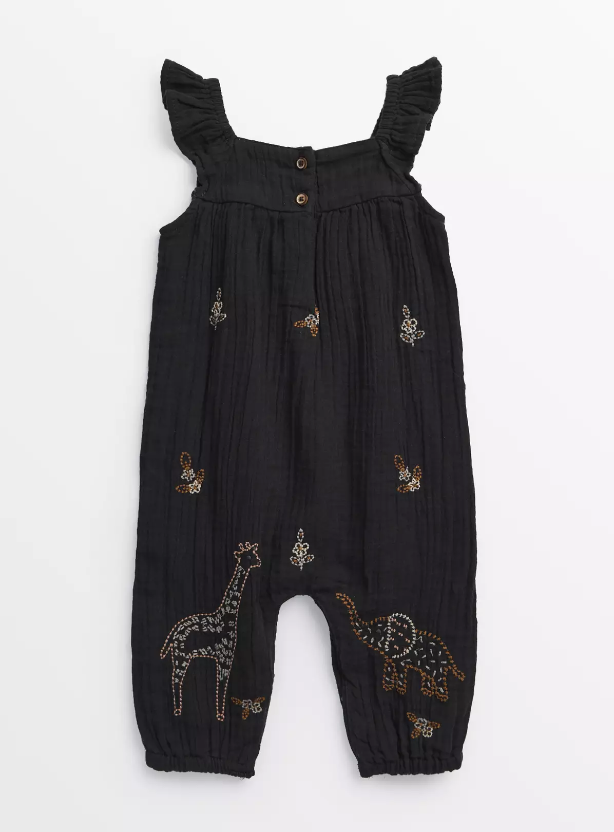 Get your little one ready for summer with our gorgeous woven romper! In black, it features a safari theme of embroidered animals and has pretty frill sleeves. A must-have for their collection!