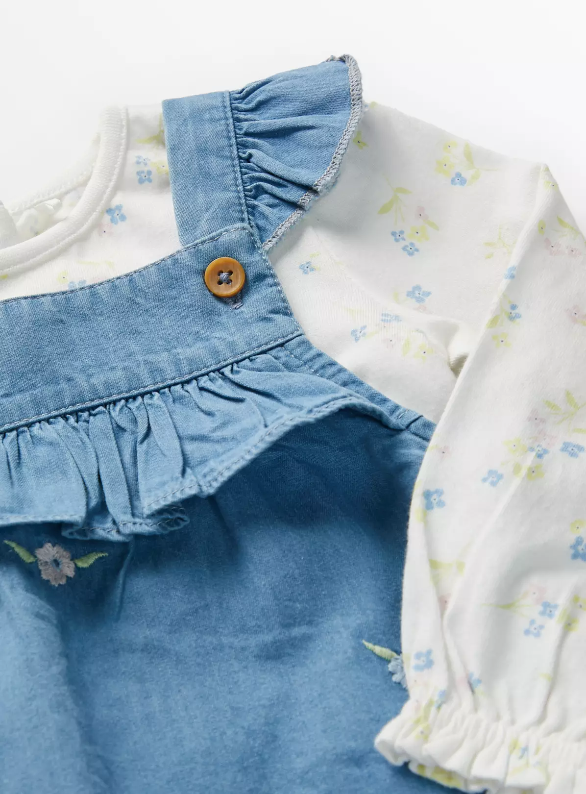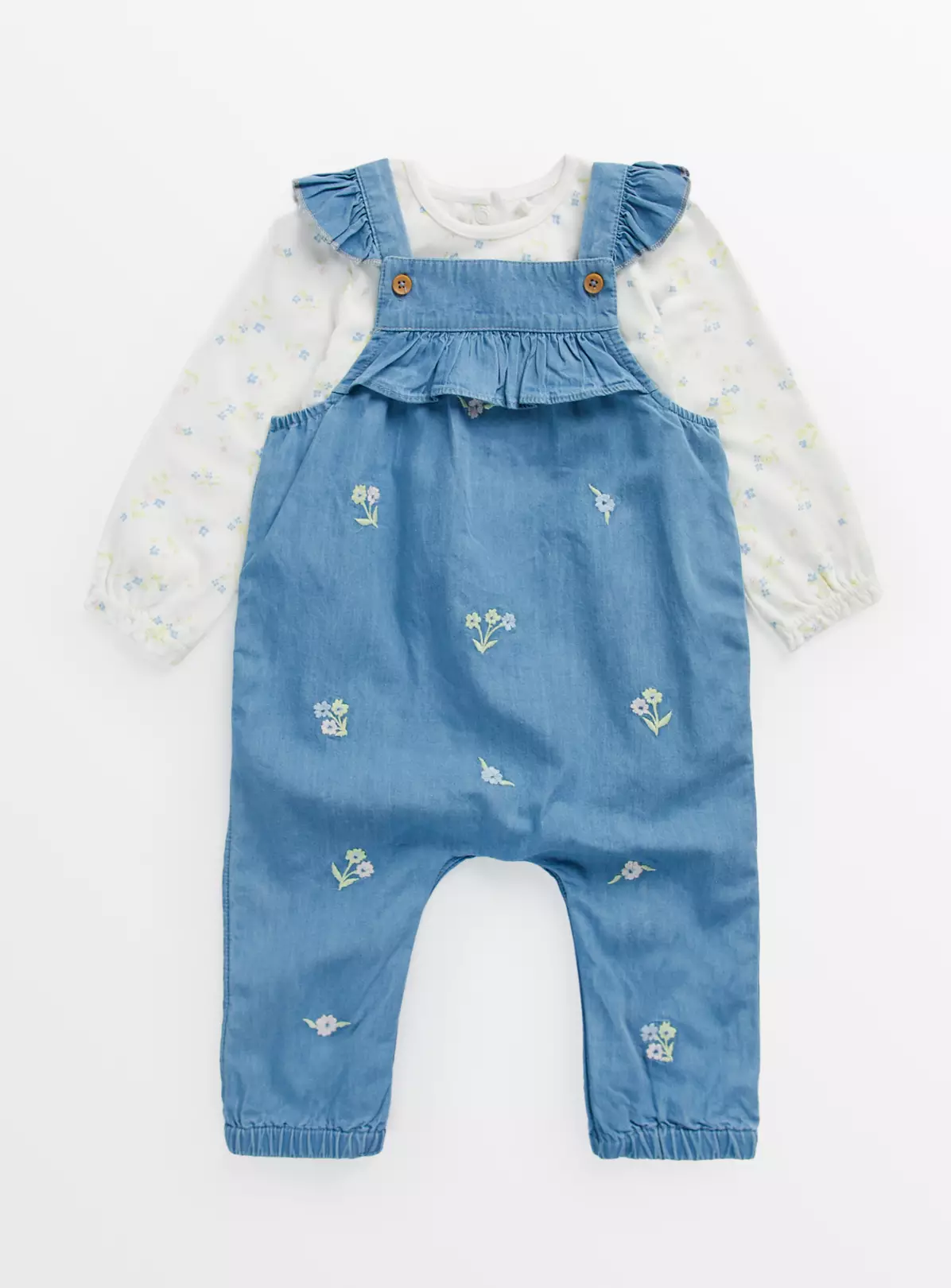 This super cute set includes a pair of blue chambray dungarees and a pretty floral print long sleeve bodysuit. It’s the perfect choice for keeping your little one looking adorable this season! The bodysuit has popper fastening for easy changes.