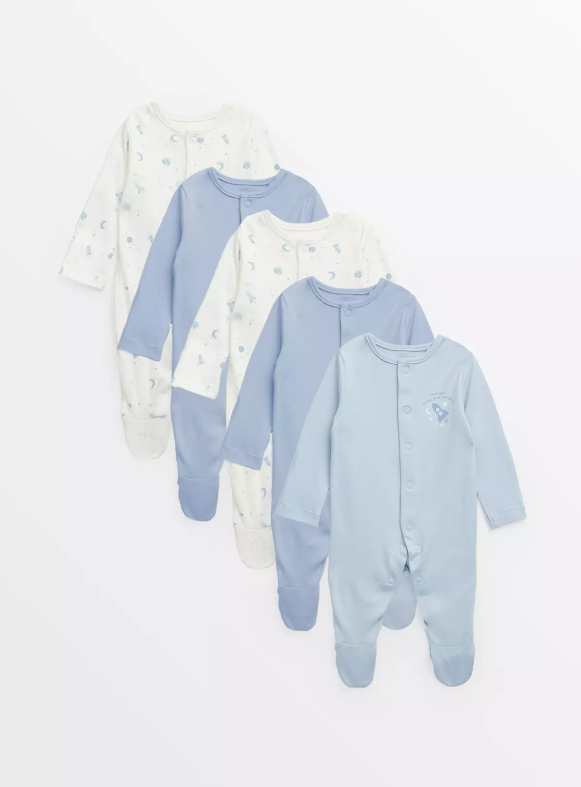Boost their everyday collection with this five pack of adorable long sleeve sleepsuits. Presented in blue and white with adorable space print and plain blue designs, they are crafted from pure cotton and feature handy popper fastenings.