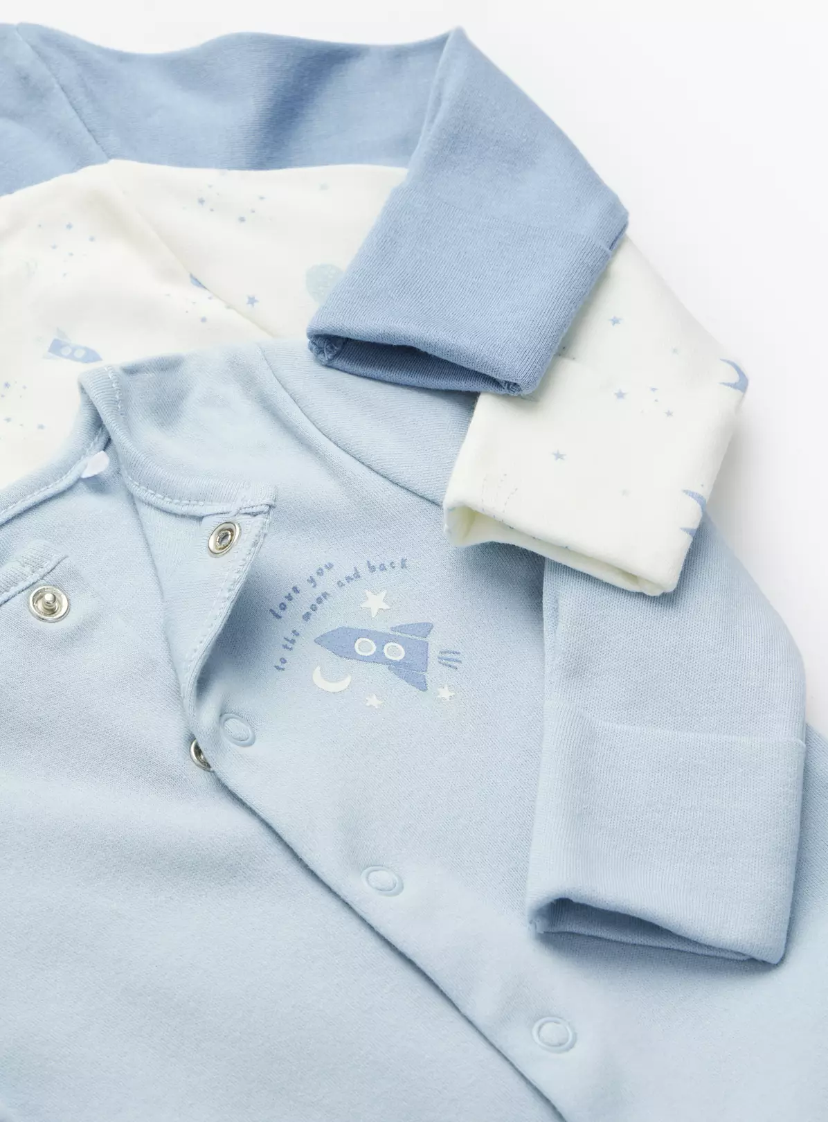 Boost their everyday collection with this five pack of adorable long sleeve sleepsuits. Presented in blue and white with adorable space print and plain blue designs, they are crafted from pure cotton and feature handy popper fastenings.
