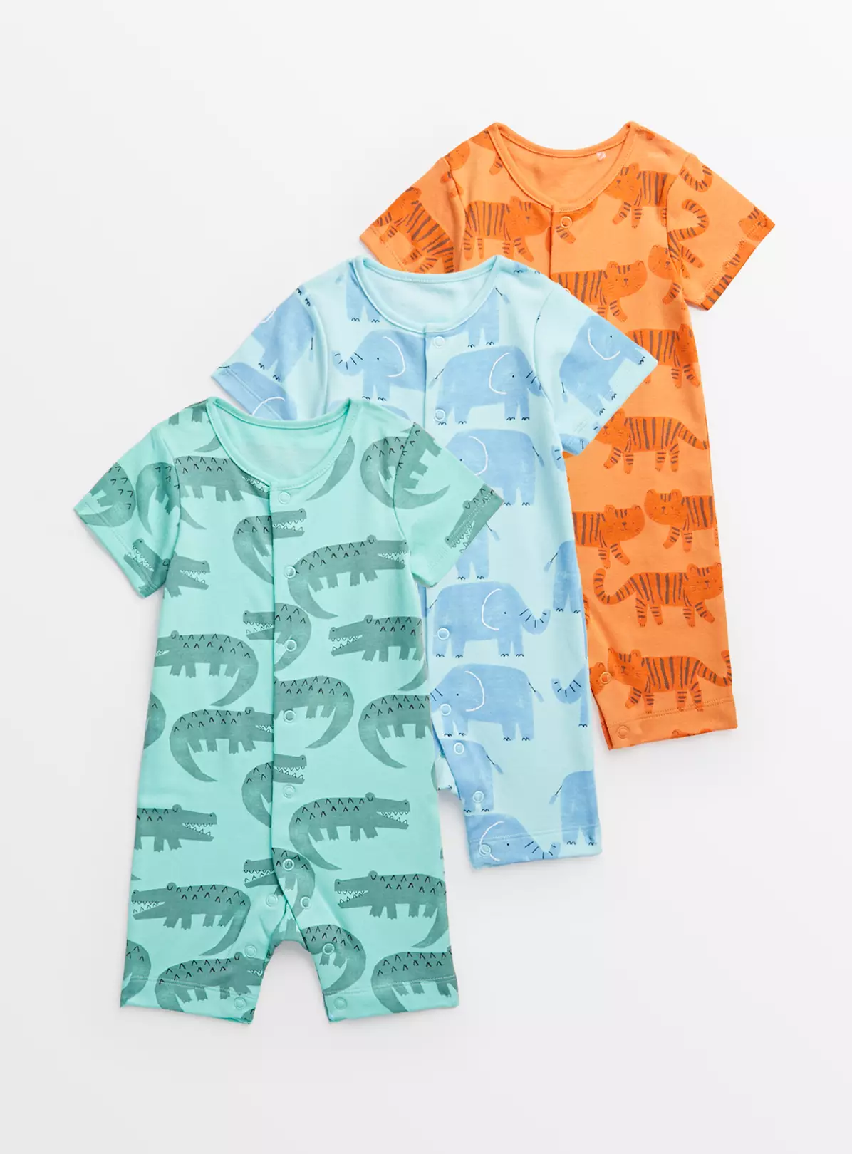 In a handy pack of 3, our romper set includes 1 blue elephant print, 1 green crocodile print and 1 orange tiger print romper. They all come with short sleeves and have popper fastening. The perfect trio for spring!