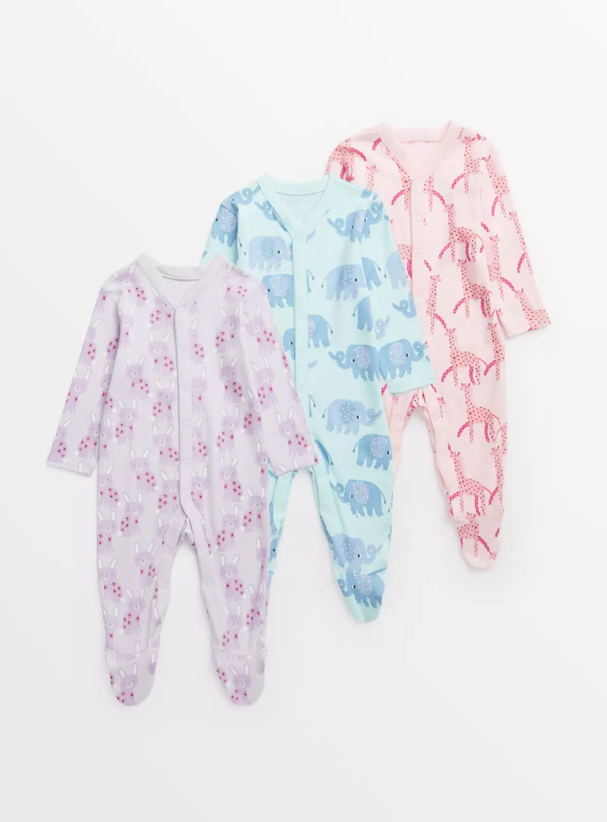 Kit out your little one with this handy 3 pack of sleepsuits. In an array of cute animal designs, they’re a must-have this season. Includes one pink giraffe print, one aqua elephant print and one lilac bunny print.