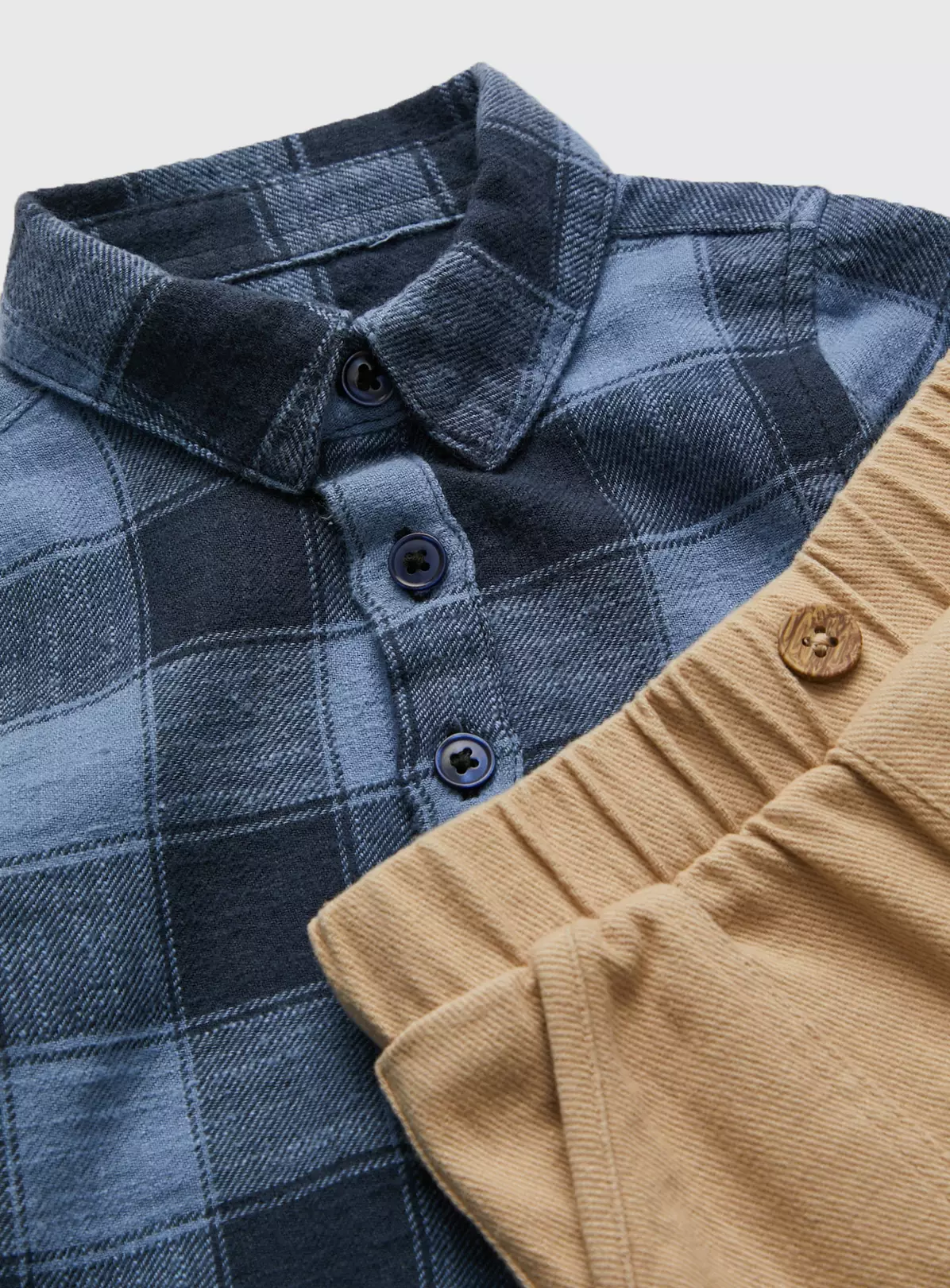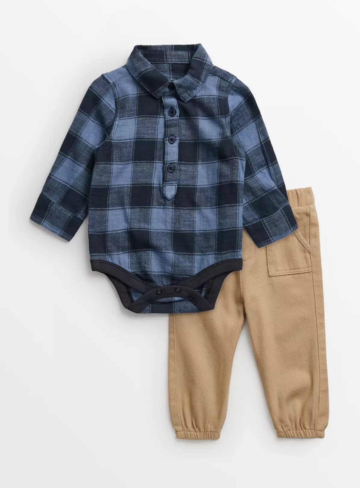 This gorgeous little set includes 1 blue check bodysuit in a shirt-style, as well as 1 pair of beige cotton trousers. The trousers feature an elasticated waist, making sure your little one stays comfy all day long! The blue bodysuit features popper fastening for easy changes.