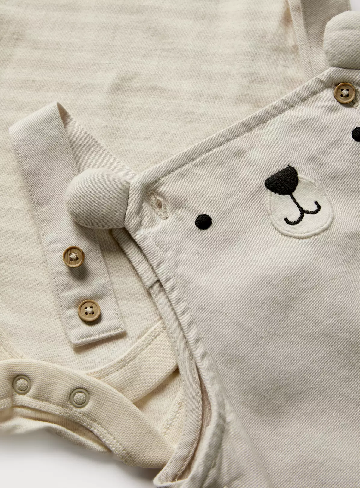 Cream Bear Face Short Dungarees & Bodysuit Set 3-6 Months