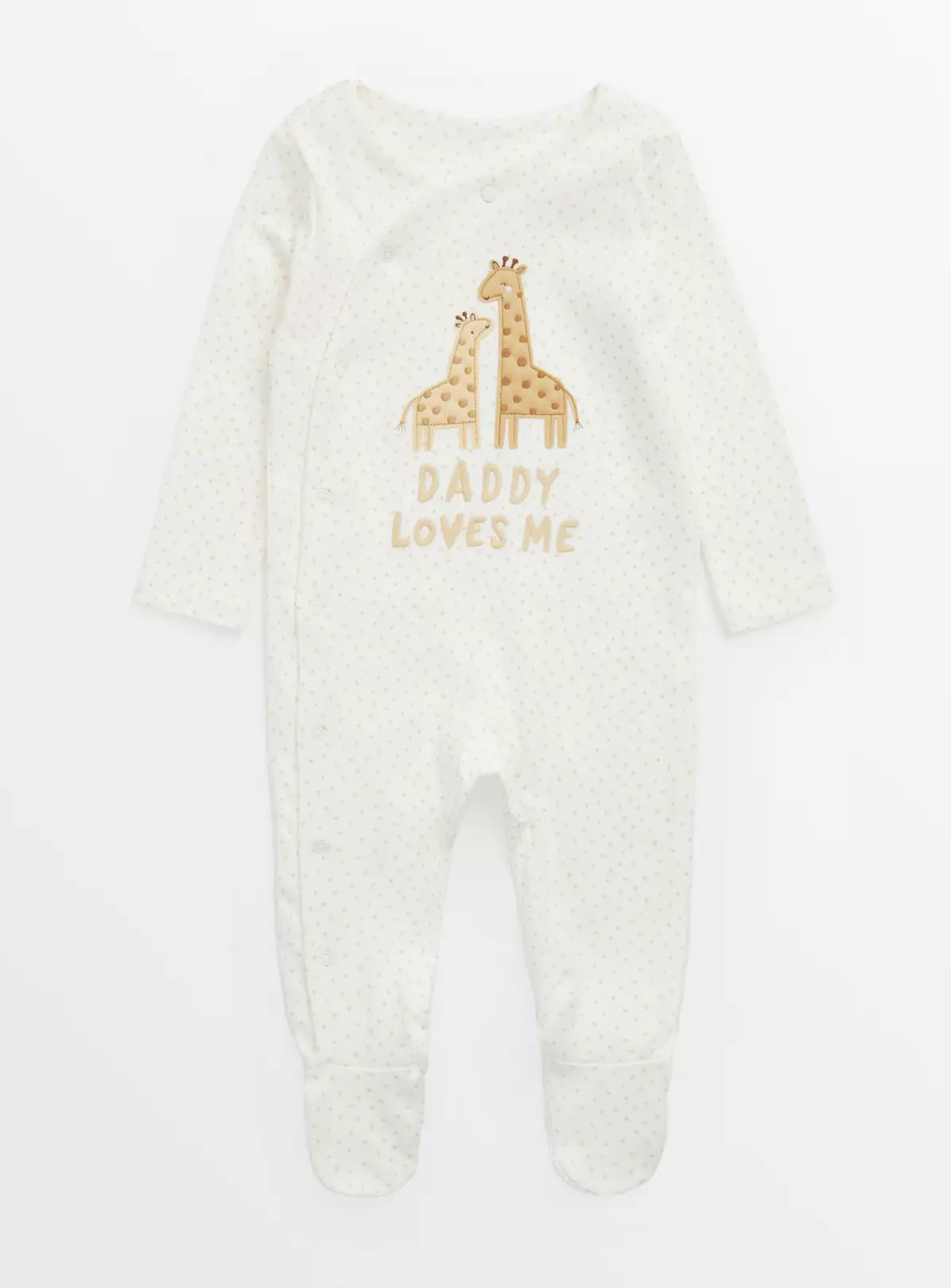 Show them love with our adorable cream sleepsuit! Featuring a ‘Daddy loves me’ slogan alongside a cute giraffe design, it also has long sleeves for a snuggly fit! Designed with popper fastening for easy and hassle-free changes.