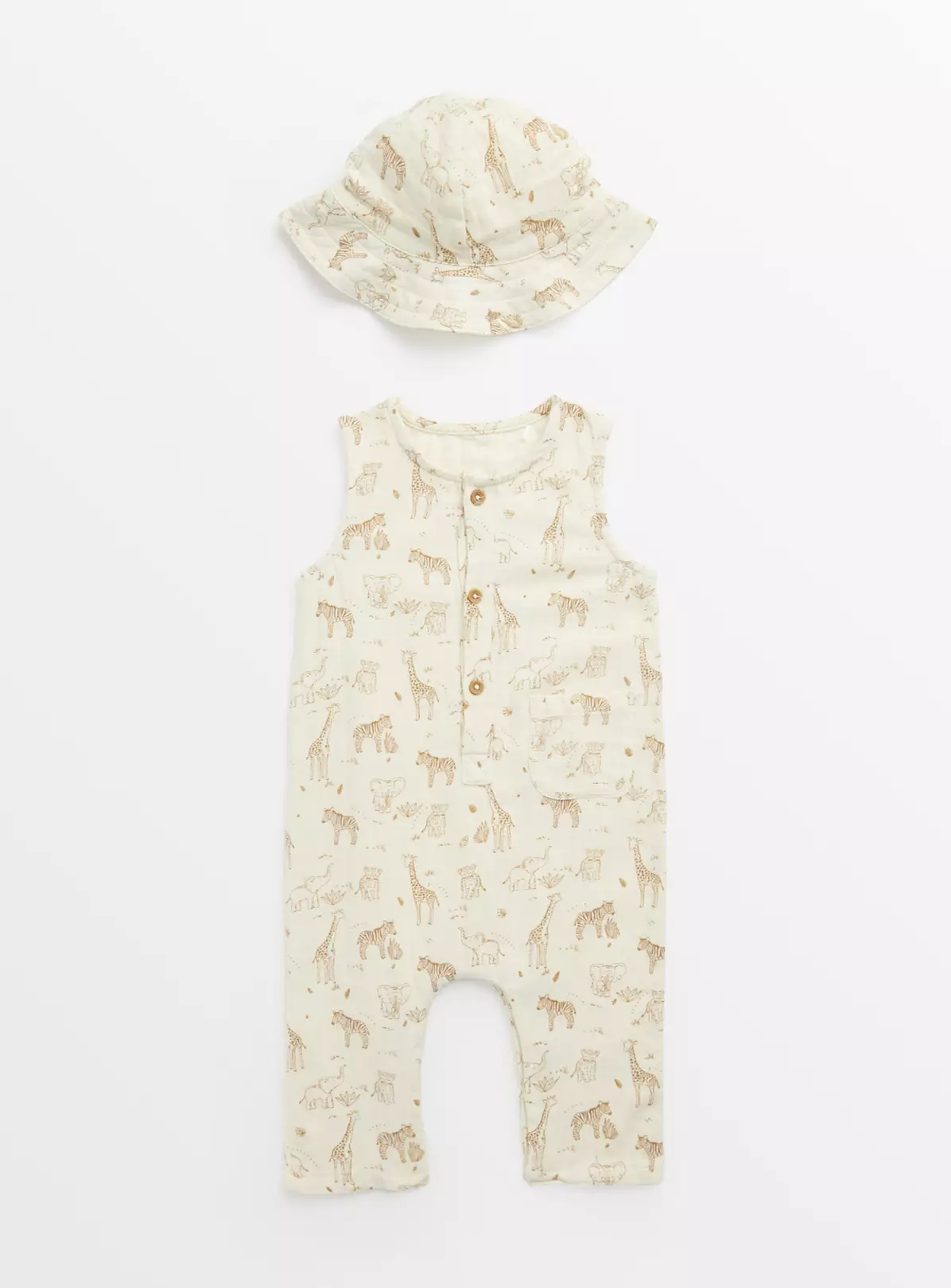 Perfect for summer and sunny days, our set includes 1 romper and 1 bucket hat in a matching safari print! In a woven fabric, it’s a comfortable outfit designed to be soft on their skin. A must-have for this mini wardrobe!