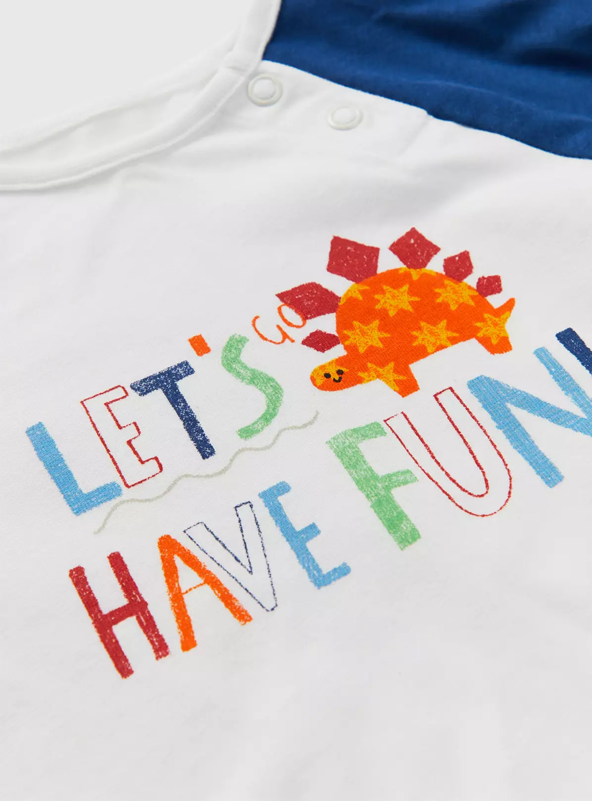 This cute ‘Lets Have Fun,’ long sleeve top features contrasting blue sleeves, a crew neckline with handy popper fastenings and a cute multi coloured Dino design to the front. Pair with cosy joggers for a super cute weekday outfit.