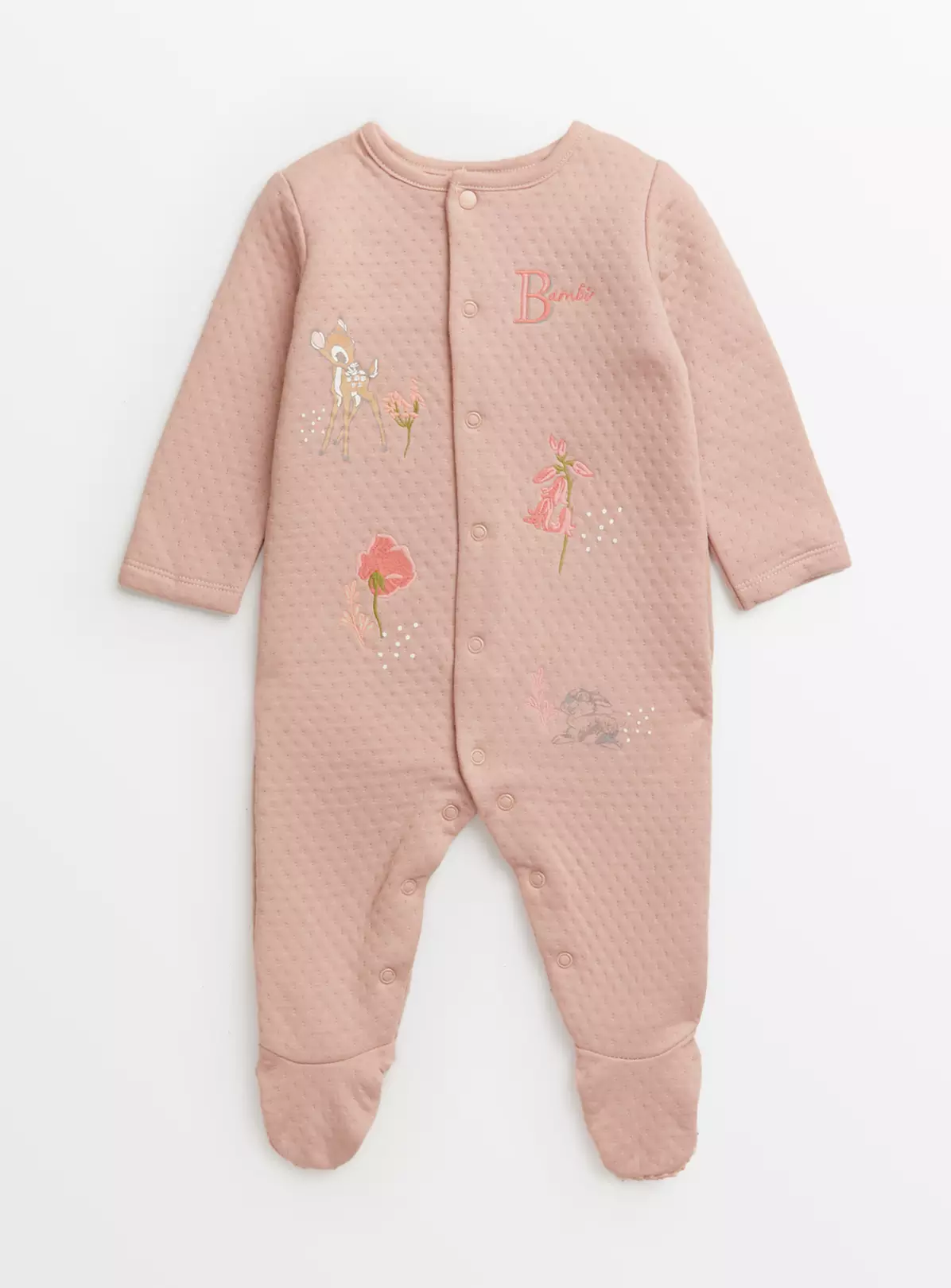 Keep little one warm and cosy in this super cute quilted sleepsuit. In a delicate shade of pale pink, it features a super cute Disney Bambi design, long sleeves and popper fastenings for easy dressing, it will definitely set them up for winter.