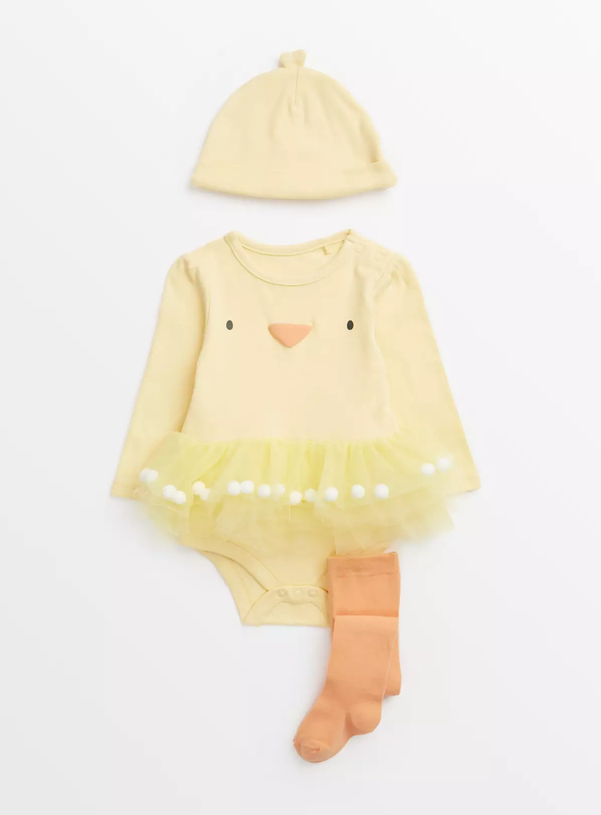 Dress them up in our adorable easter chick set! It includes 1 long sleeve bodysuit which comes in a yellow design with a tutu and handy popper fastening, as well as a cute matching hat and tights.