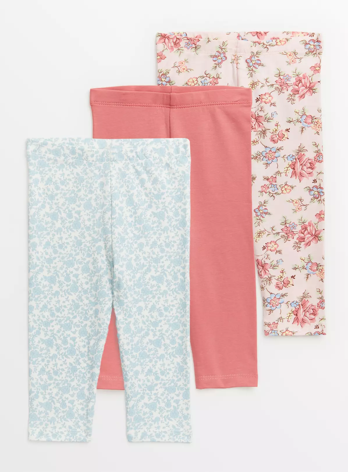 Super cute and super comfy, our adorable leggings help you stock up on their essentials in style! Includes one light pink floral, one light blue floral and one plain pink pair. The pink floral ones have frilly ruffles for an extra cute look!
