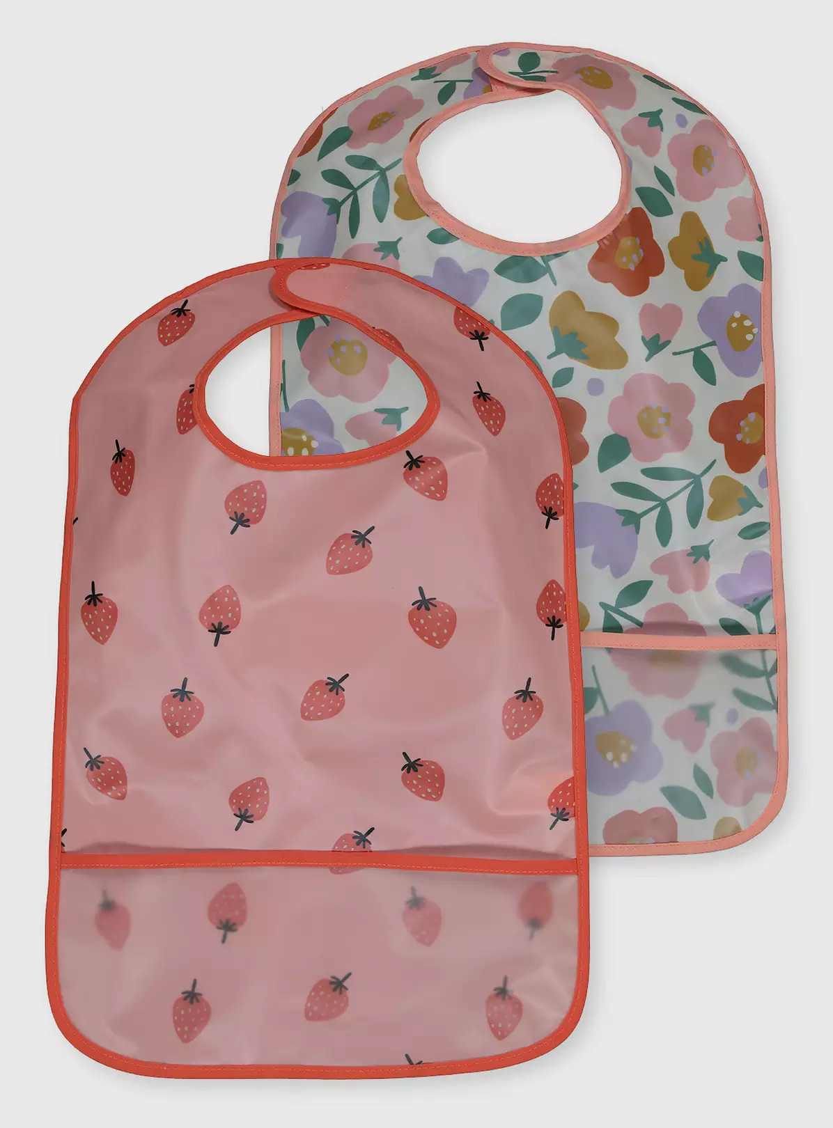 Mucky mealtimes will be a thing of the past with these pink floral and strawberry bibs. With a pocket at the bottom for catching scraps, and one touch fastening at the back for easy changes, you’re going to want a few!
