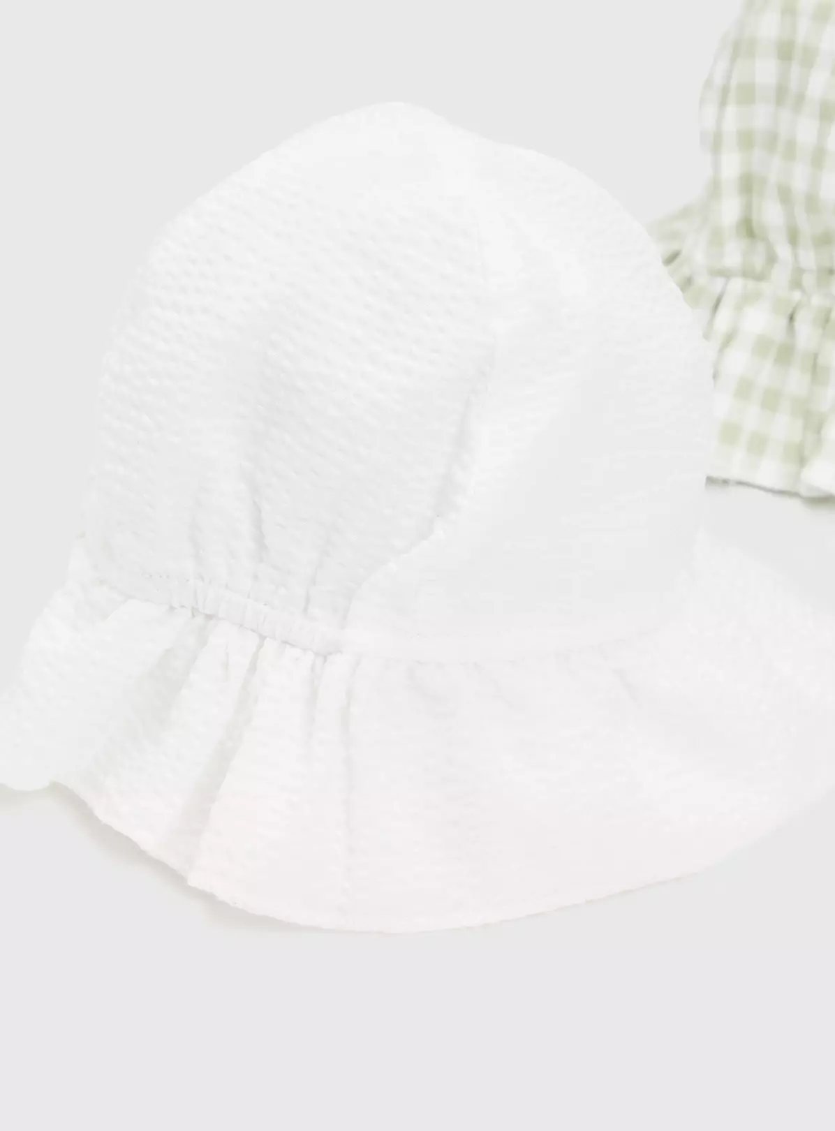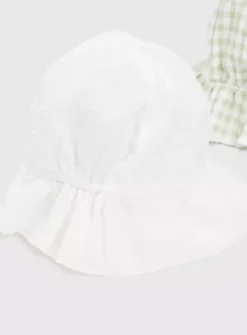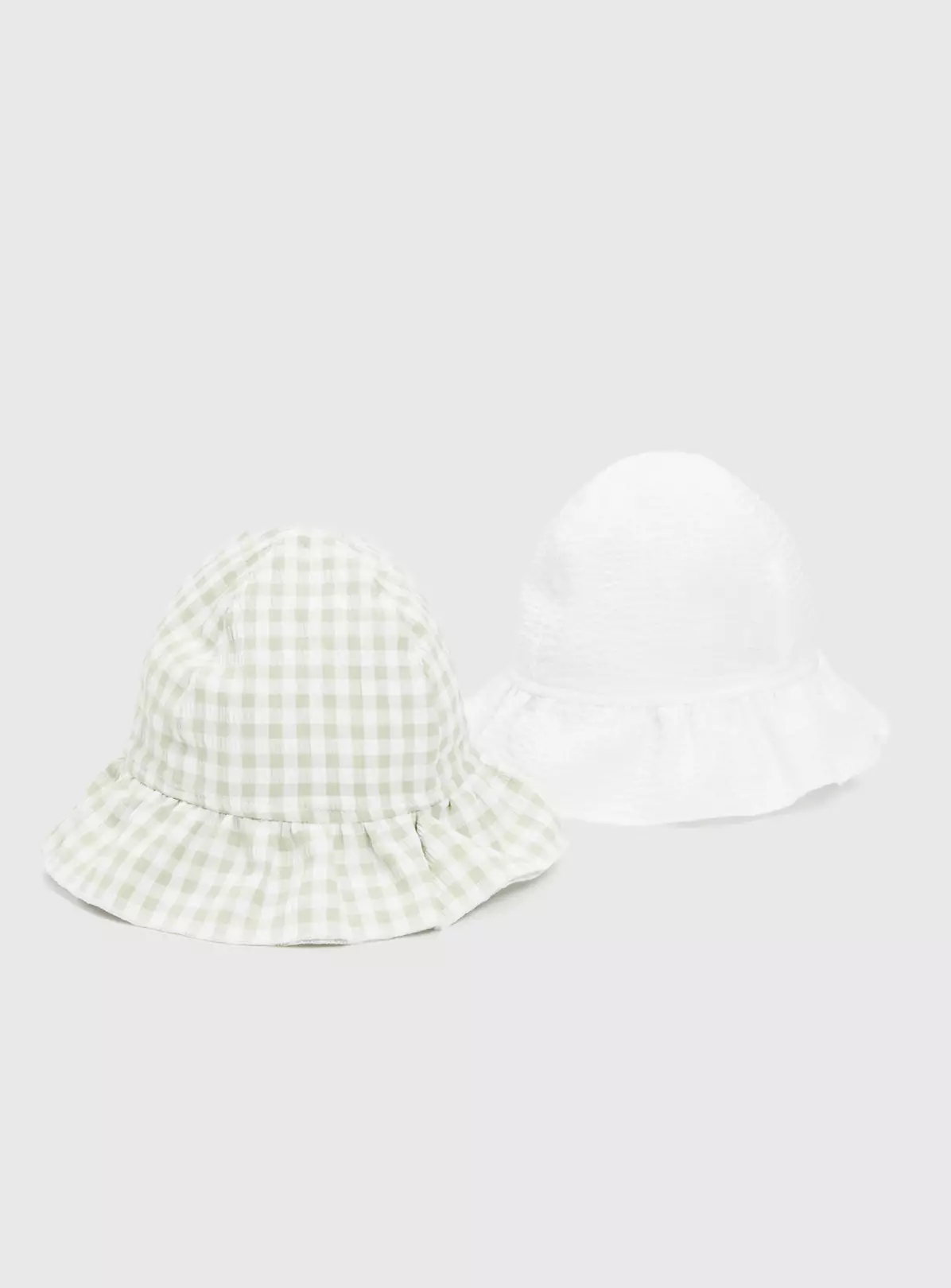 Our two pack of bucket hats are perfect for packing in their case for summer holidays, or for playtime fun in the garden. With two different designs to choose from, one is plain white and made from a seersucker fabric and the other is a super cute green gingham. With UPF50+ protection from the sun.
