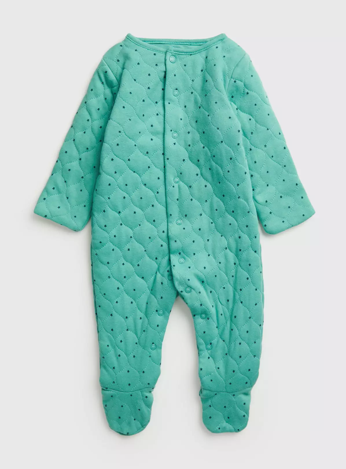 Send your little one off to sleep in our cosy quilted green and navy star print sleepsuit. With a winter weight of 2.5 tog and a coloured popper detail for easy dressing.