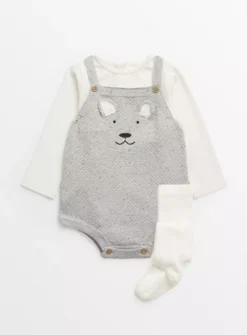 Our adorable set includes 1 grey knitted romper, 1 cream bodysuit and 1 pair of cream tights to match! The romper features a super cute bear design on the front and has value fastening for hassle-free changes.