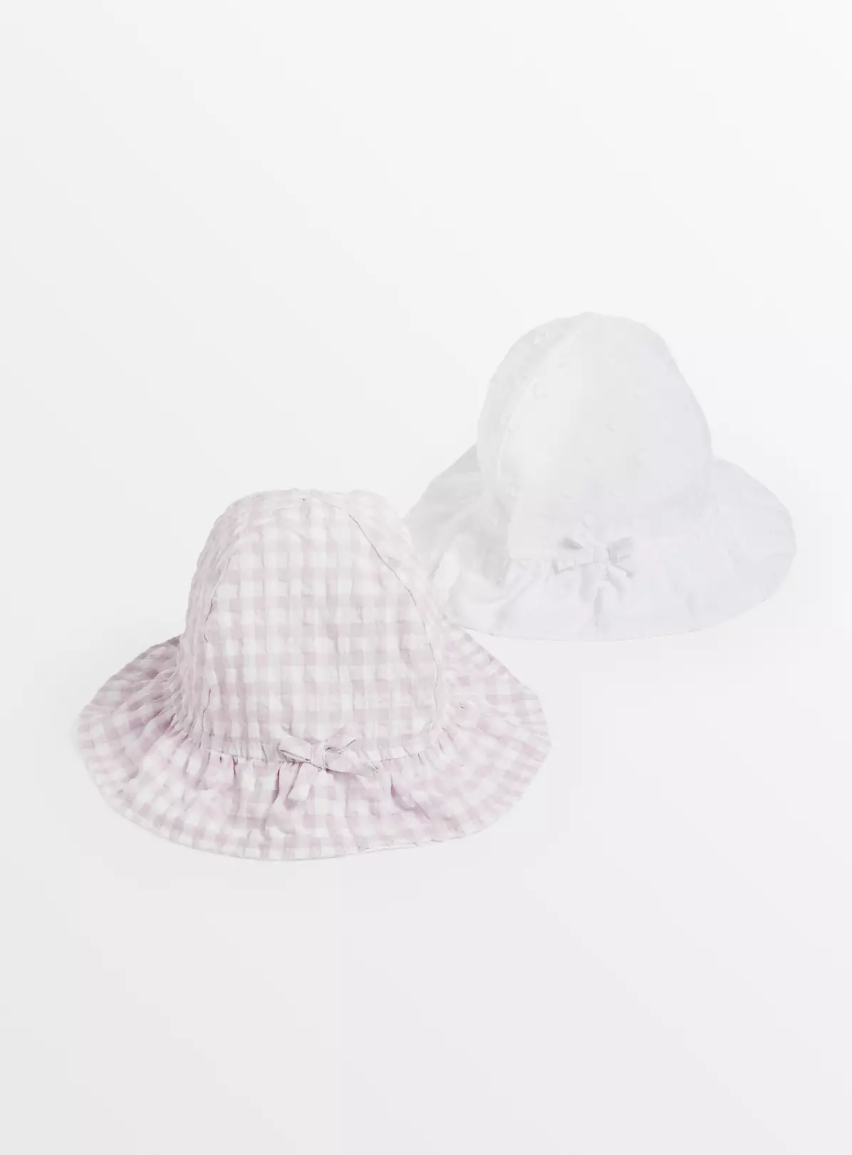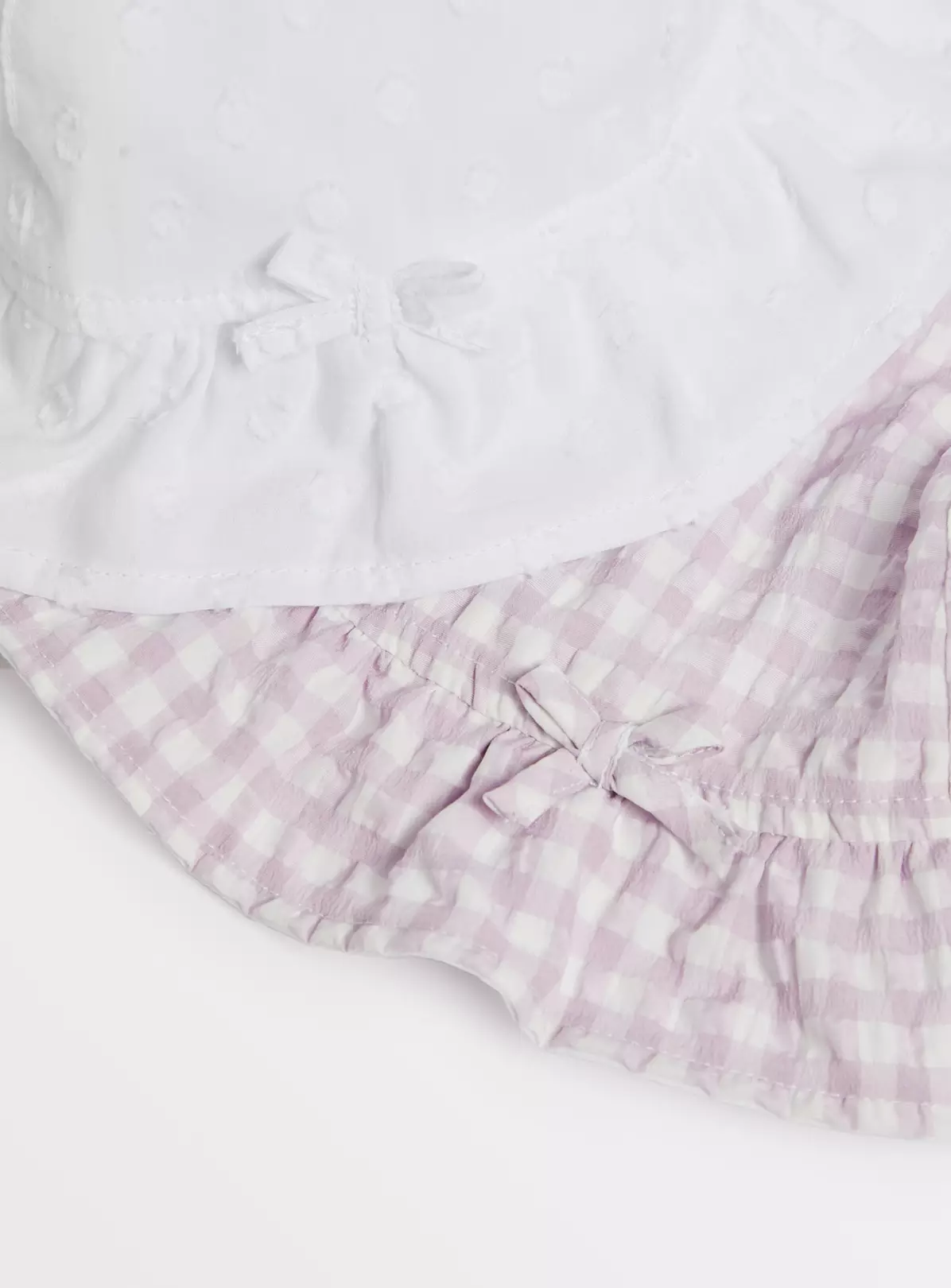 Our two pack of bucket hats are perfect for packing in their case for summer holidays, or for playtime fun in the garden. With two different designs to choose from, one is plain white and made from a seersucker fabric and the other is a super cute lilac gingham. With UPF50+ protection from the sun.