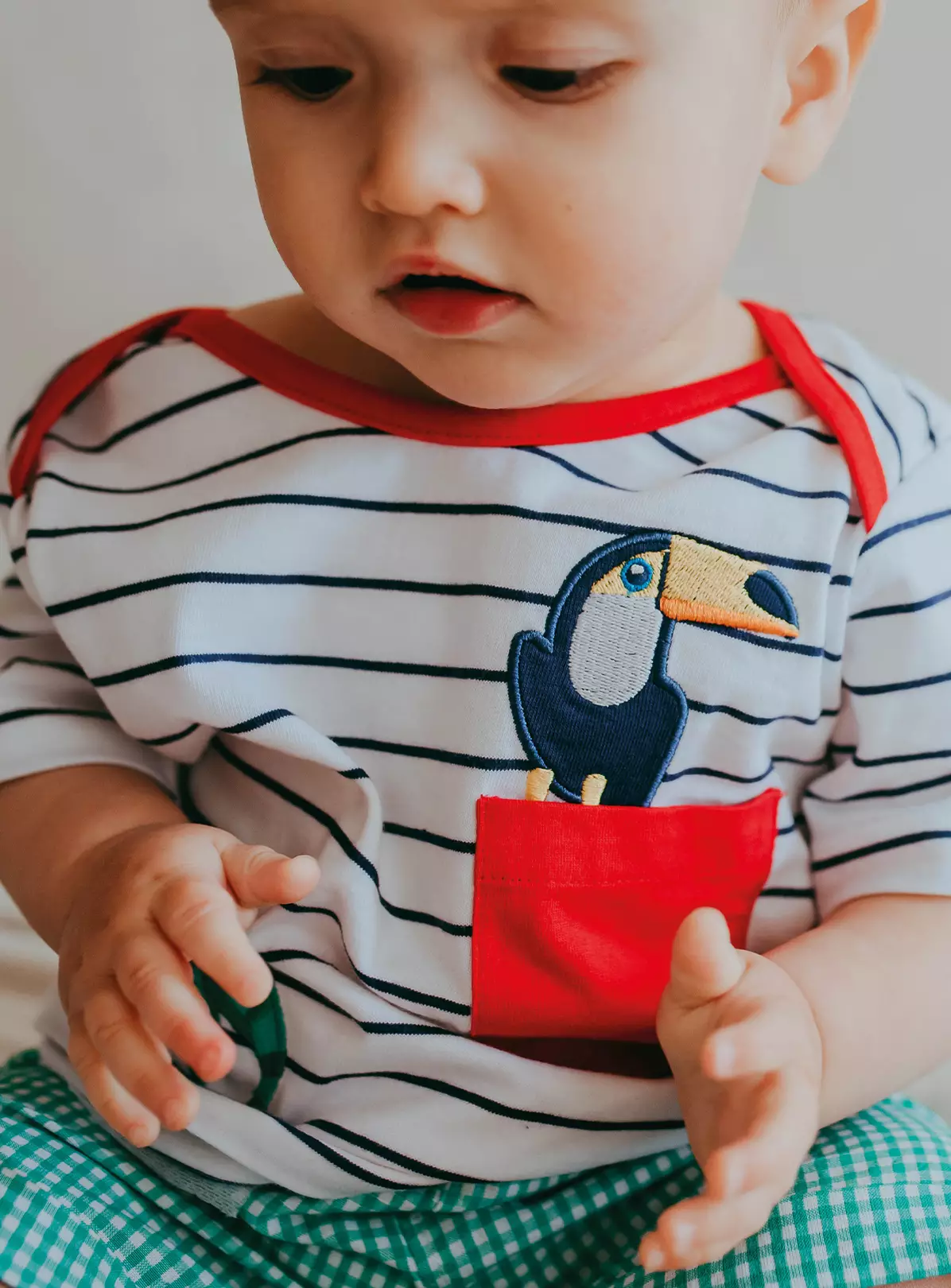 Made from our super-soft 100% GOTS organic cotton fabrics, this jersey pocket top & shorts baby set make outfitting easy for spring & summer adventures and cosy playdates. This 2-piece set features a short-sleeved stripe t-shirt with our toucan and chameleon friends and co-ordinating gingham shorts.