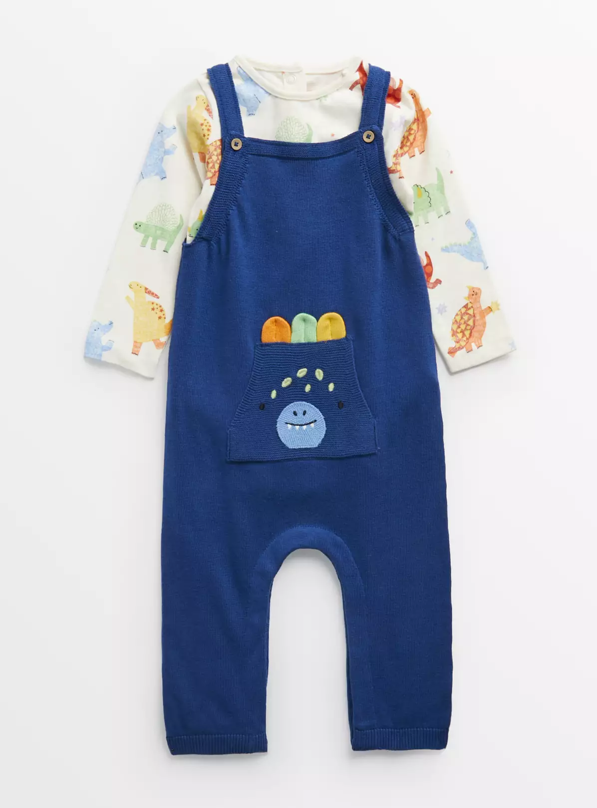 Get ahead for spring with this adorable navy dungarees and bodysuit combo. Super cute, the dungs feature novelty motifs and the coordinating dino print bodysuit has a crew neck and long sleeves.