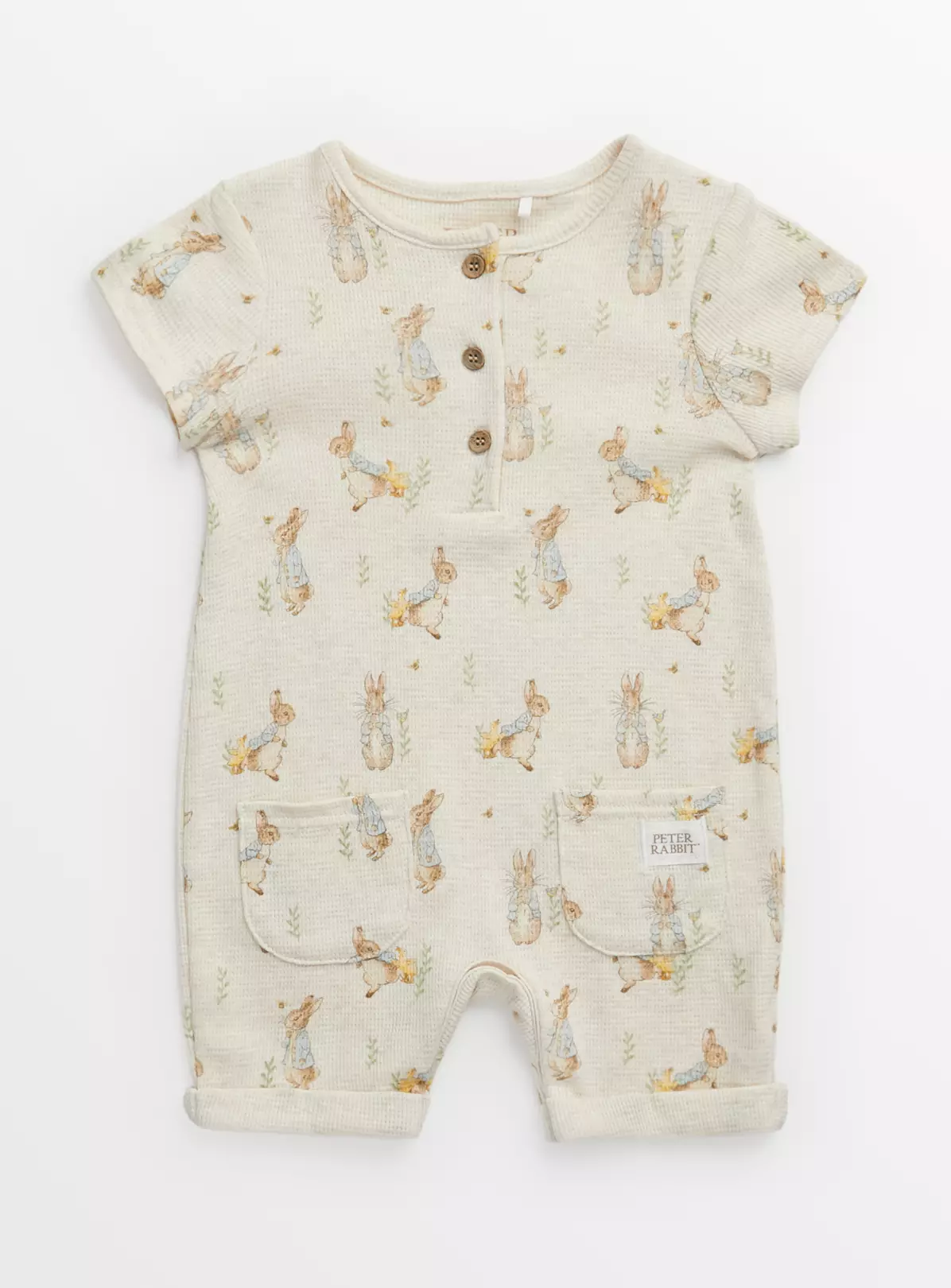 Crafted from pure cotton jersey, our adorable beige romper features an all-over Peter Rabbit print. In a traditional style, it has three values to the neck, short sleeves and two dinky pockets. Perfect for spring!