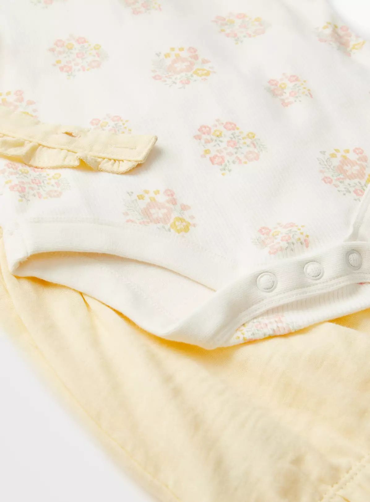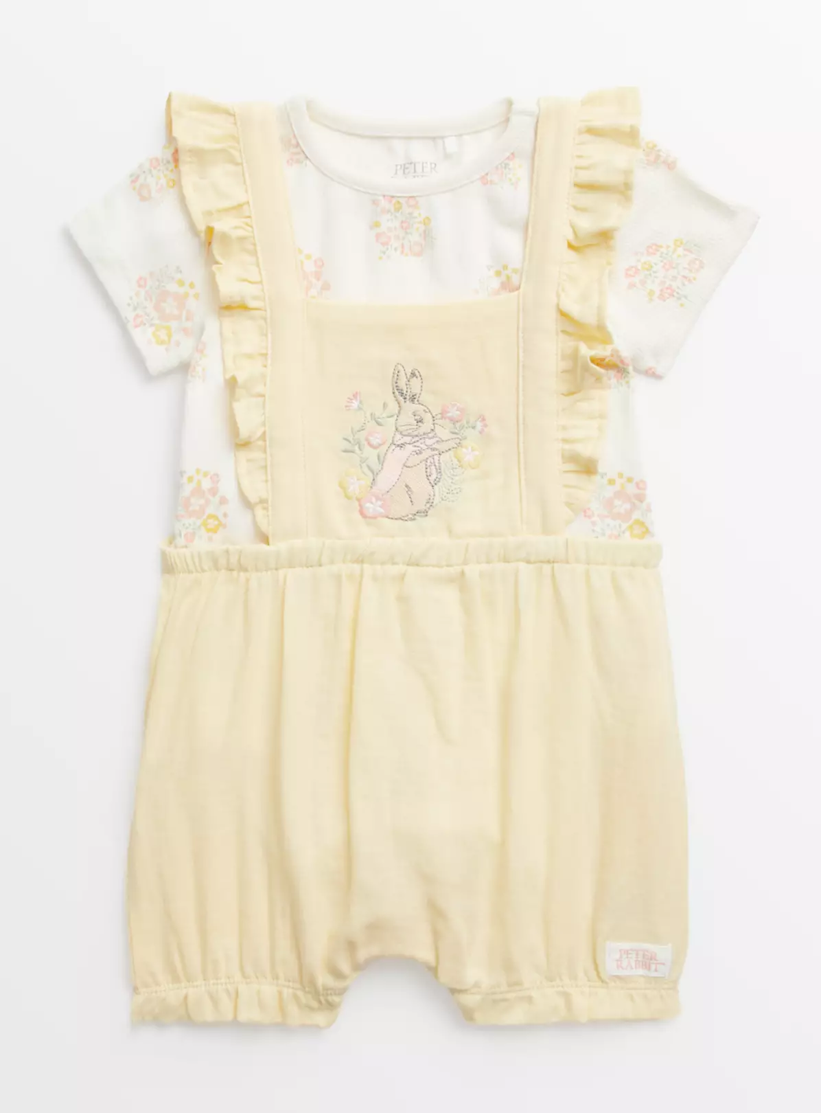 Our adorable yellow bibshorts and bodysuit set is perfect for spring. The bibshorts have super cute Peter Rabbit illustrations on the front and they team perfectly with the coordinating bodysuit. Oh so cute!