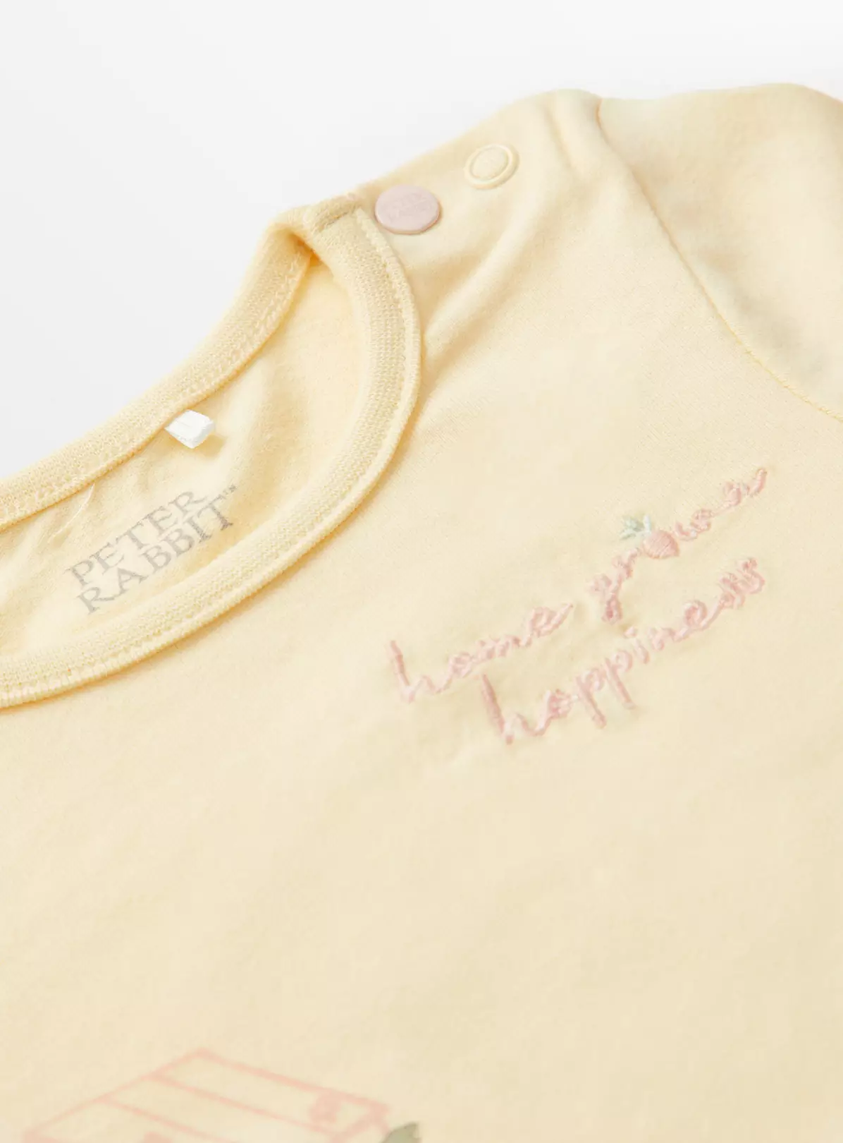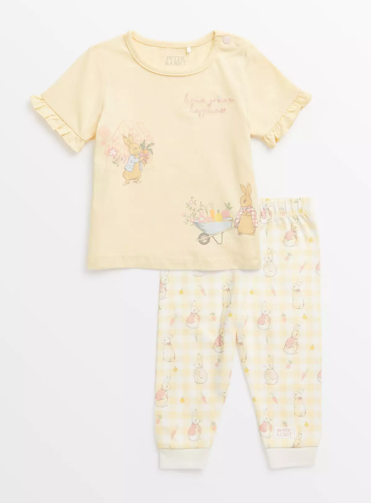 Our adorable yellow pyjama set is perfect for spring. The t-shirt features Beatrix Potter illustrations and has frill details on the sleeves. This set also includes 1 pair of yellow check bottoms which feature Peter Rabbit designs and have an elasticated waist.