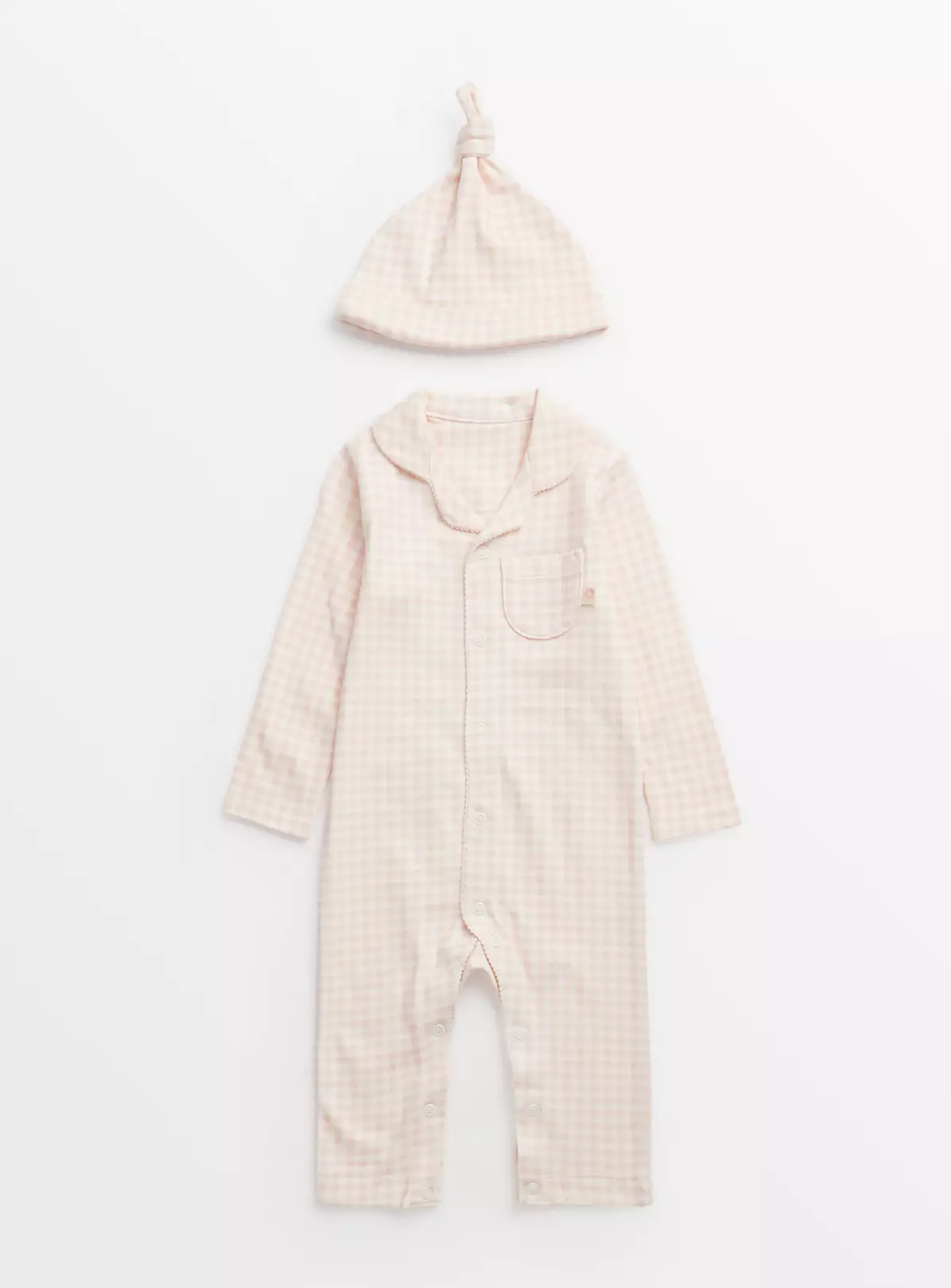 Crafted from cotton, our pink romper features an all-over gingham design. In a traditional style, it has popper fastening and a cute collar. It also comes with a lovely hat to match!