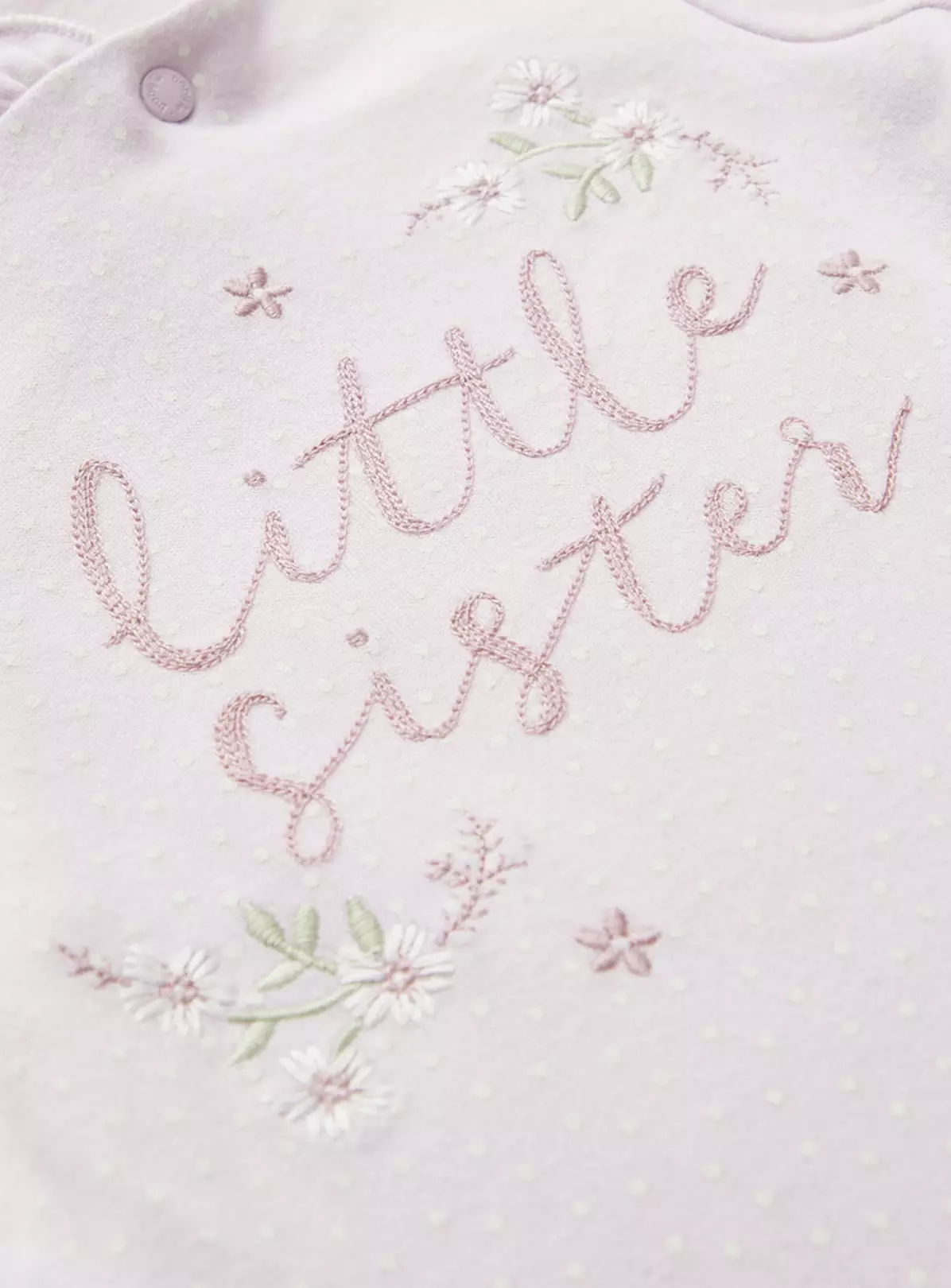 A sleepsuit made for the sweetest little sister! Our pink floral sleepsuit features a wrap front with a frill detail and a ‘Little sister’ embroidered slogan. It also has popper fastening for easy changes.