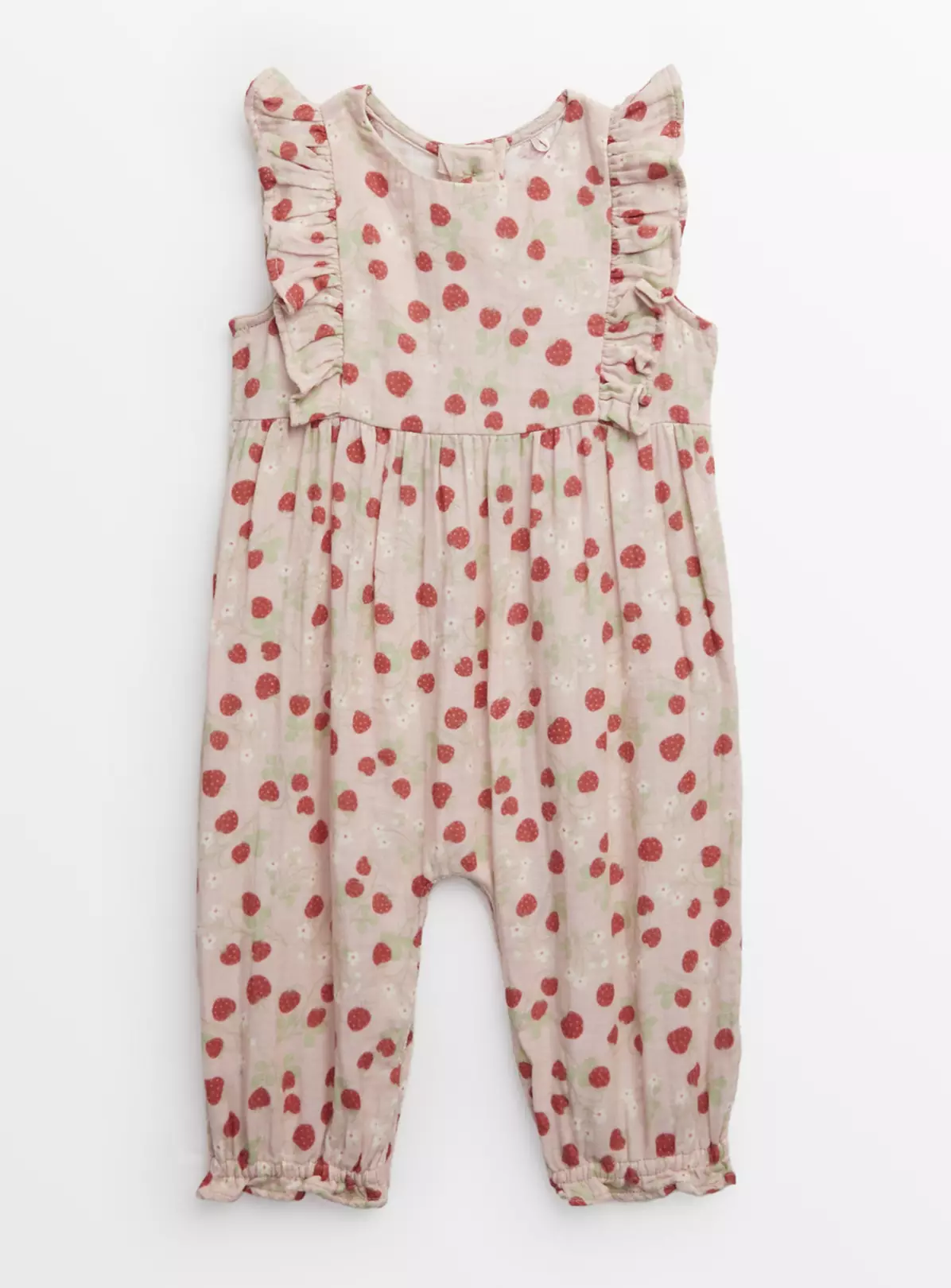 In a gorgeous strawberry print, our romper is the perfect option for weekend wear! In a comfy cotton fabric, it features frill sleeves and has value fastening designed for hassle-free changes.