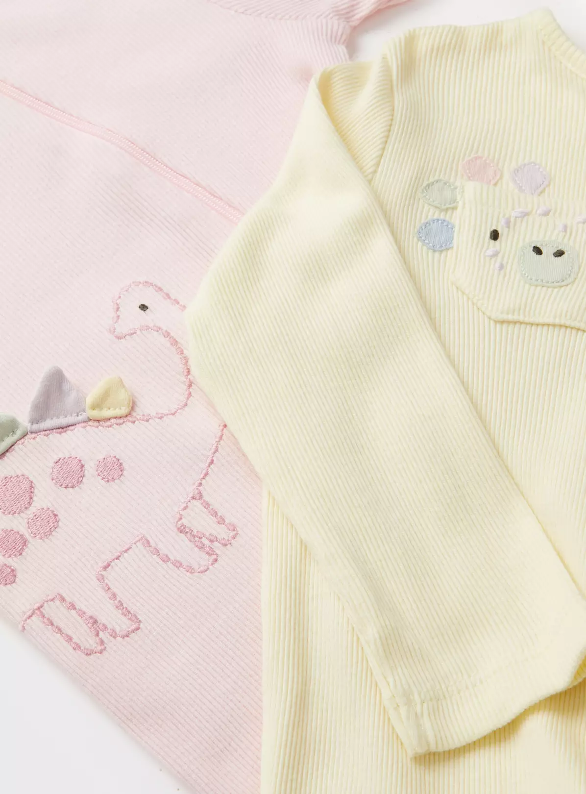 Featuring dinosaur designs, our 2 pack of sleepsuits are a cute and comfy option for night time. This pack includes 1 pink and 1 yellow sleepsuit, featuring zip fastening on the front for easy, hassle-free changes.