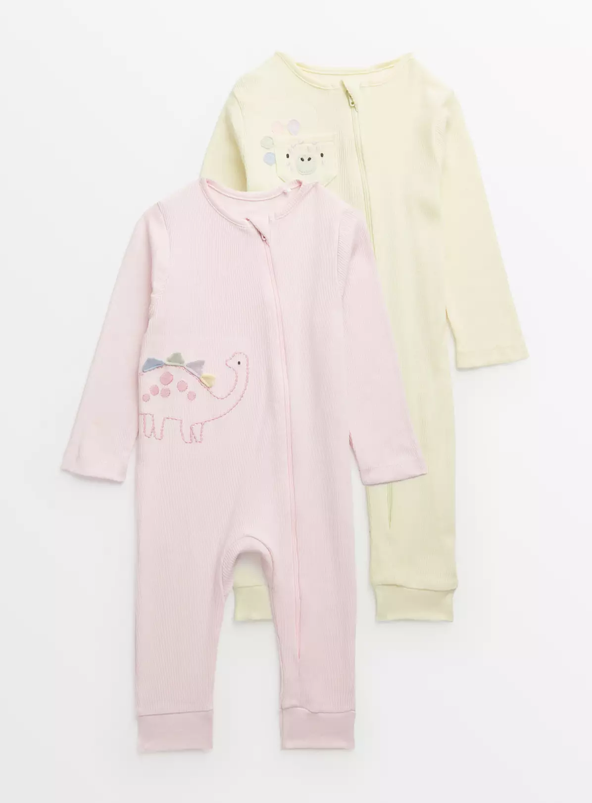 Featuring dinosaur designs, our 2 pack of sleepsuits are a cute and comfy option for night time. This pack includes 1 pink and 1 yellow sleepsuit, featuring zip fastening on the front for easy, hassle-free changes.