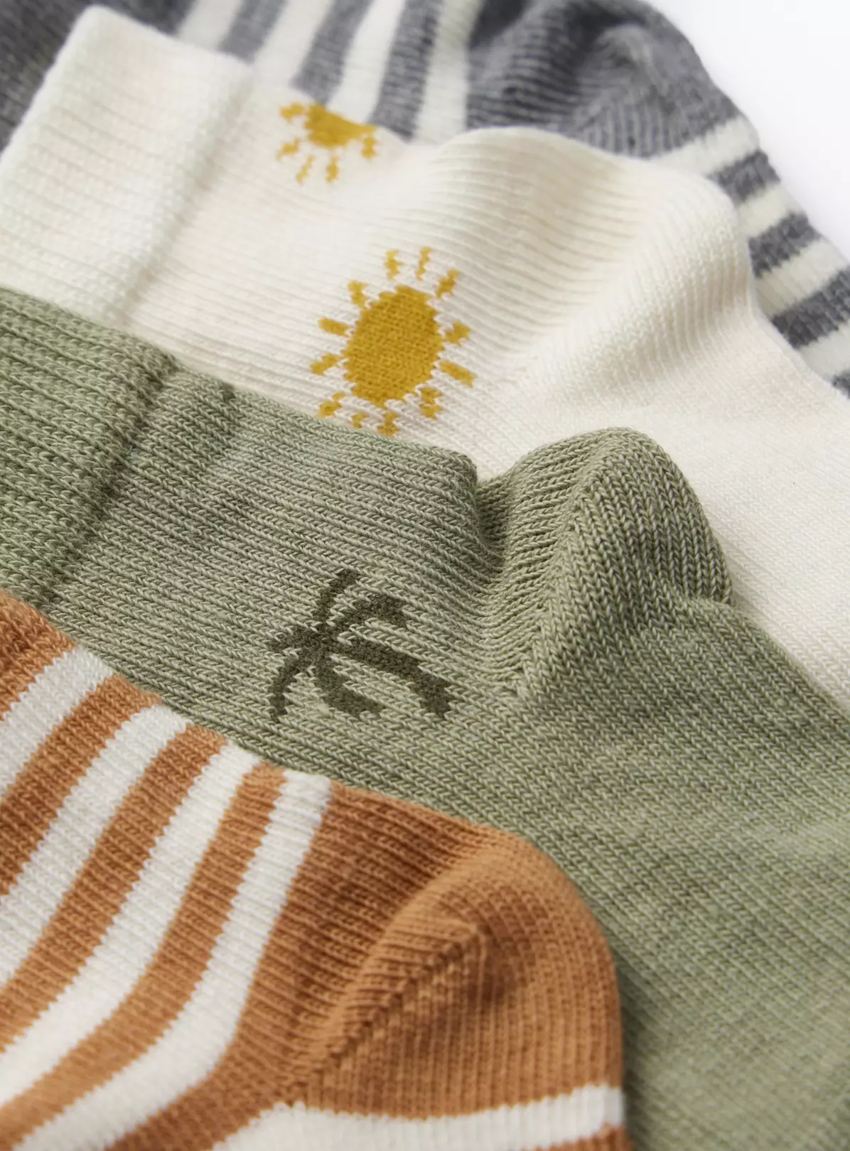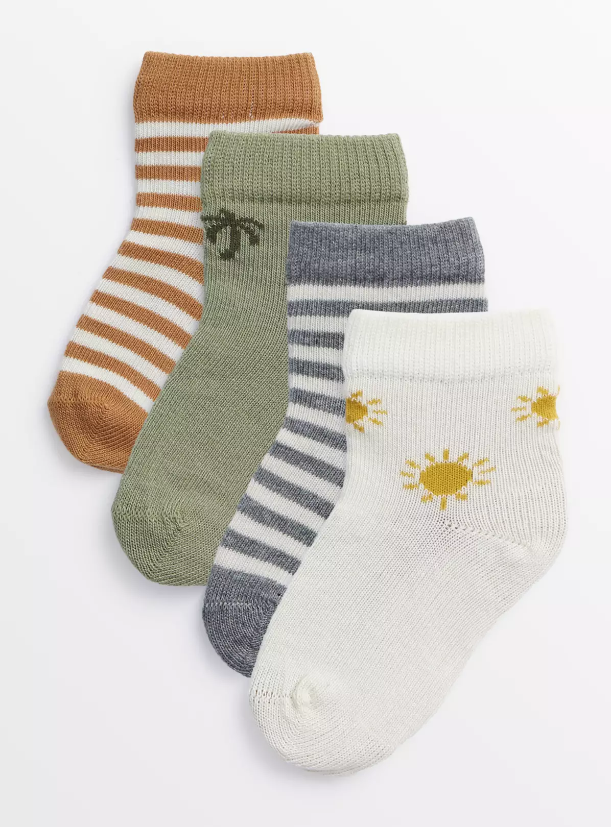 Add a summer theme to their sock collection this season with our adorable 4 pack of socks! This pack includes 1 cream pair with a sun print, 1 khaki pair with a palm tree design, 1 orange stripe and 1 grey stripe pair. A comfy addition to their collection!