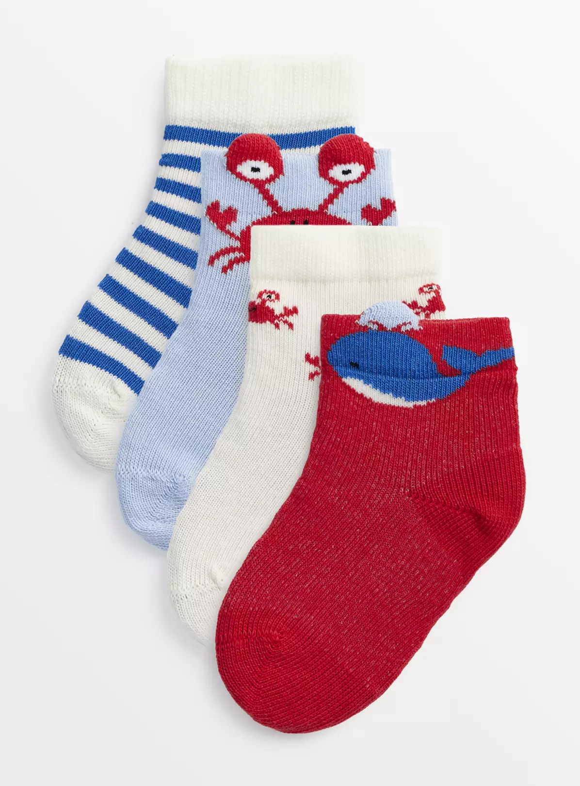 Add a fun seaside theme to their collection with our 4 pack of socks! This set includes 1 blue pair with a crab print, 1 white pair with a crab print, 1 blue and white striped pair and a red pair with a whale design! Super cute and super comfy!
