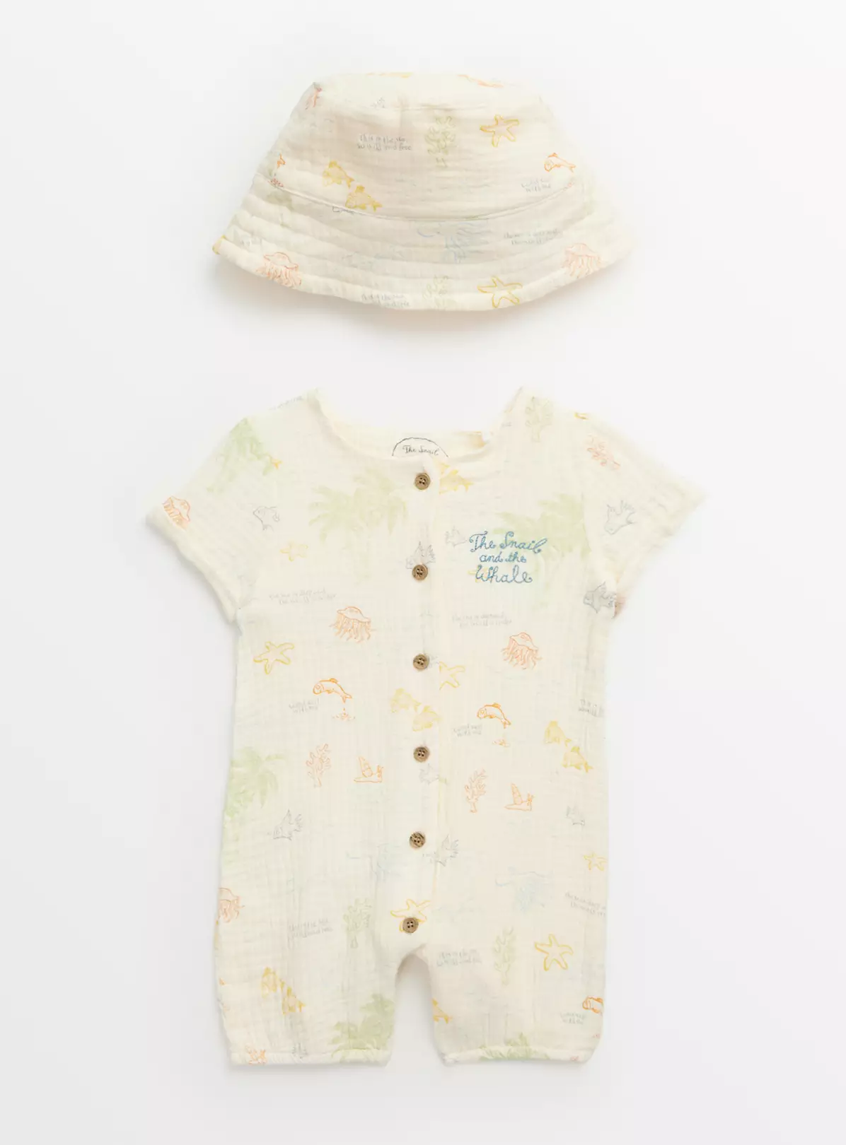 Inspired by Donaldson’s iconic children’s book, The Snail and the Whale, our set is the perfect option for summer days! This set includes 1 short sleeve cream romper which comes in an all-over print and 1 bucket hat to match!