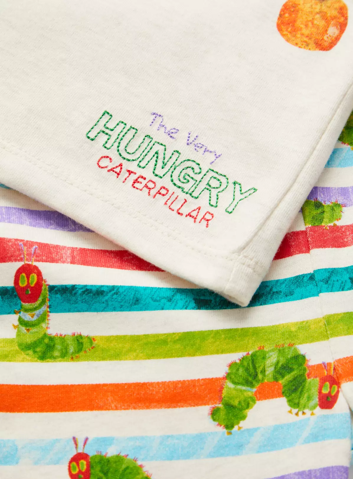 Inspired by the iconic book The Very Hungry Caterpillar, our adorable pyjama set is a comfy addition to their little wardrobe! This set includes 1 white long sleeve top with a cute print on the front, as well as 1 pair of stripe bottoms to match!