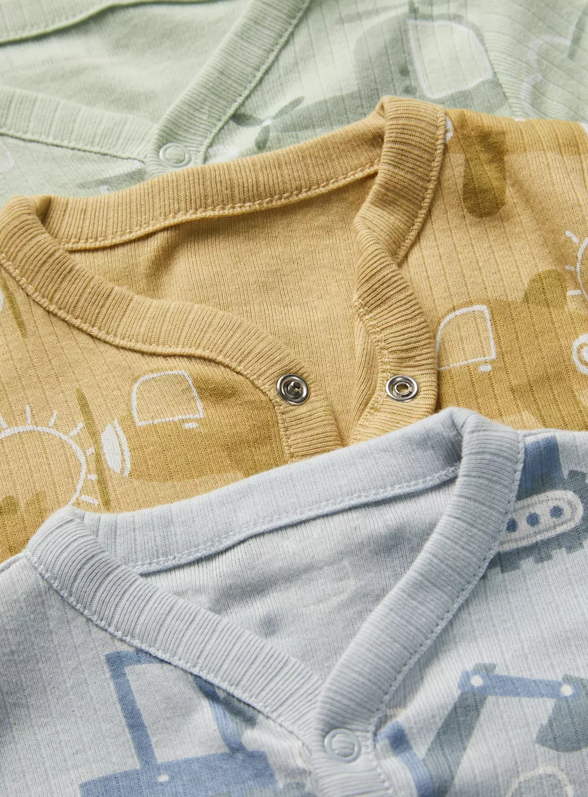 Kit out your little one with this adorable trio of sleepsuits. In a comfy pure cotton, they come in a variety of colours which include green, taupe and blue in super cute transport prints.