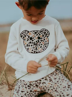 In a snow-ecru base colourway, our rib long-sleeve kids top features our leopard animal jacquard pattern and a bear-y cute bear applique your little cubs will love. Made from our super-soft 100% GOTS organic cotton fabric, this sustainable kids top is perfect for those colder days – playing outdoors or snuggling on the sofa! Plus, this gender-neutral top is kind to your child’s skin and eco-friendly to our environment too. Complete the look with any of our non-seasonal range of baby pants, skirts, leggings or joggers… or match-back with our Leopard Animal Jacquard Leggings for unique outfitting!