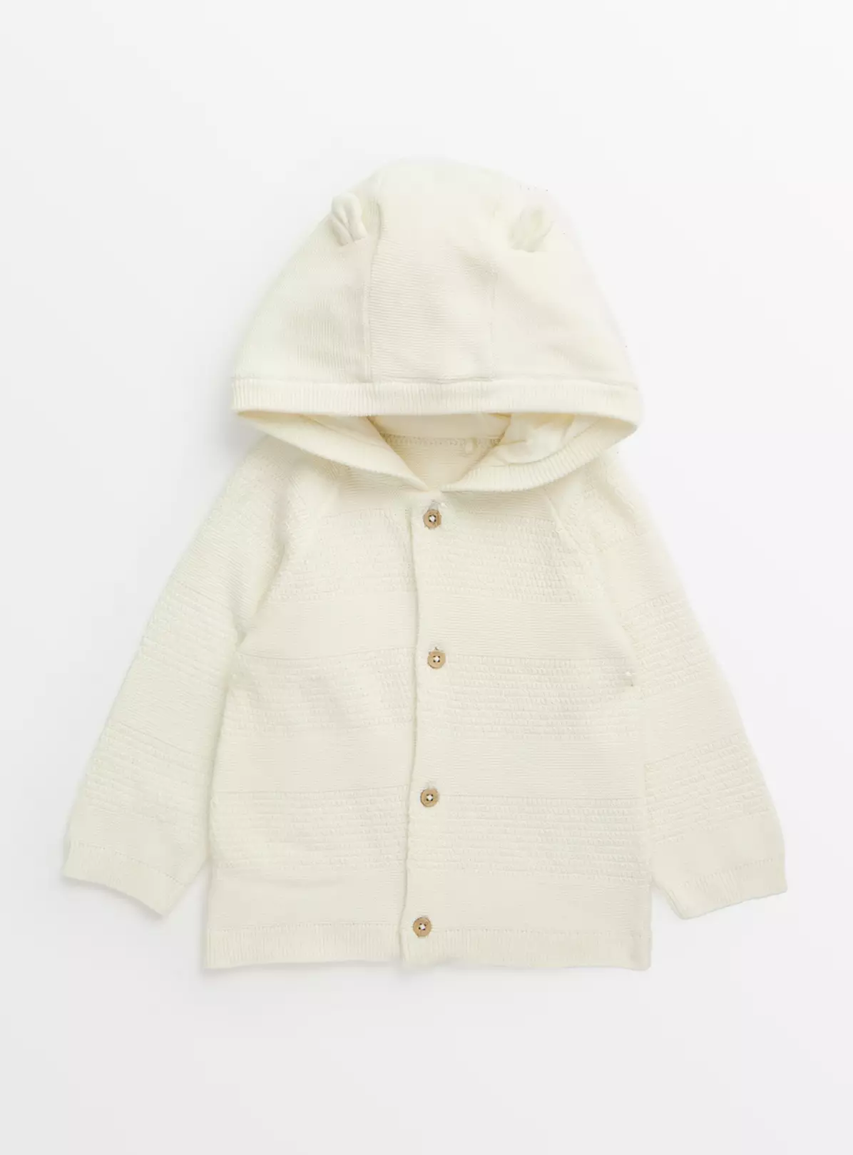 Keep your little one cosy in our white cardigan. It features adorable bear ear details on the hood and has value fastening designed for hassle-free dressing. An essential for every mini wardrobe.
