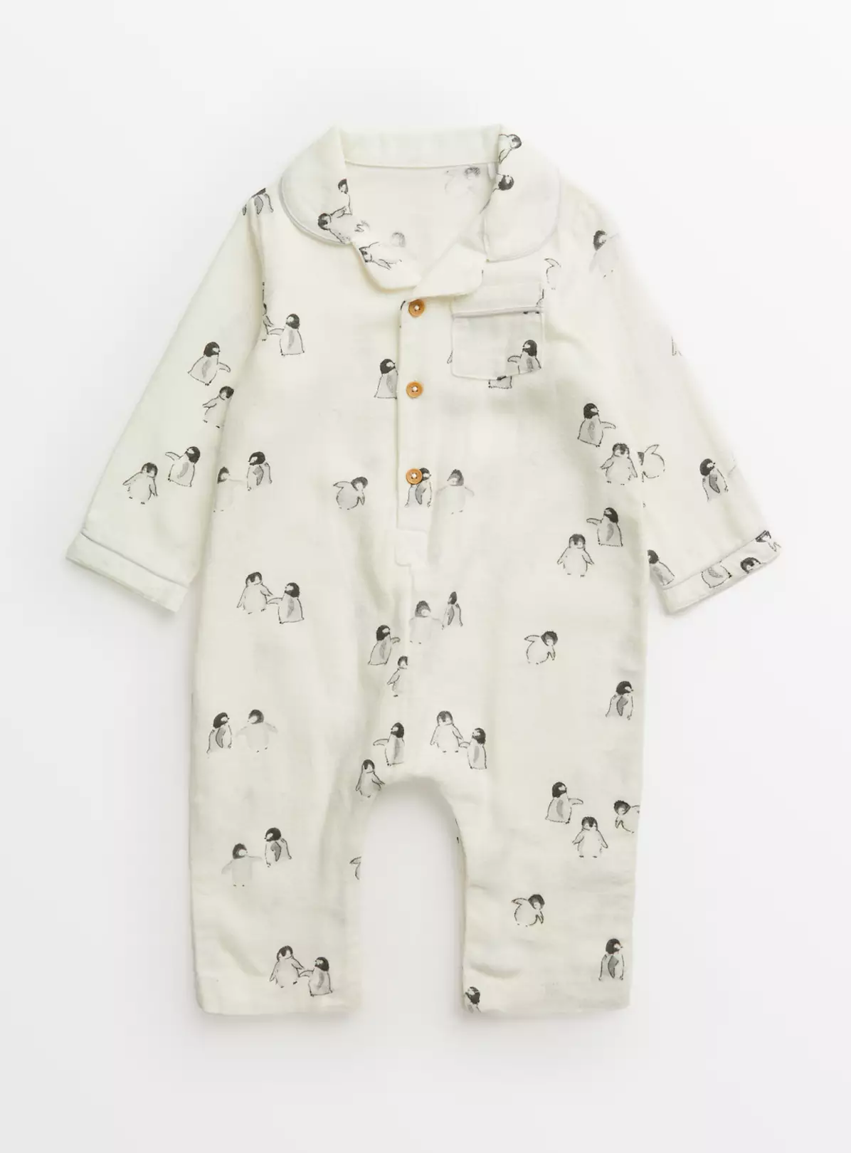 Crafted from cotton, this white romper features an all-over penguin print. In a traditional style, it has value fastenings, a cute collar and front pocket. Perfect for chilly nights!