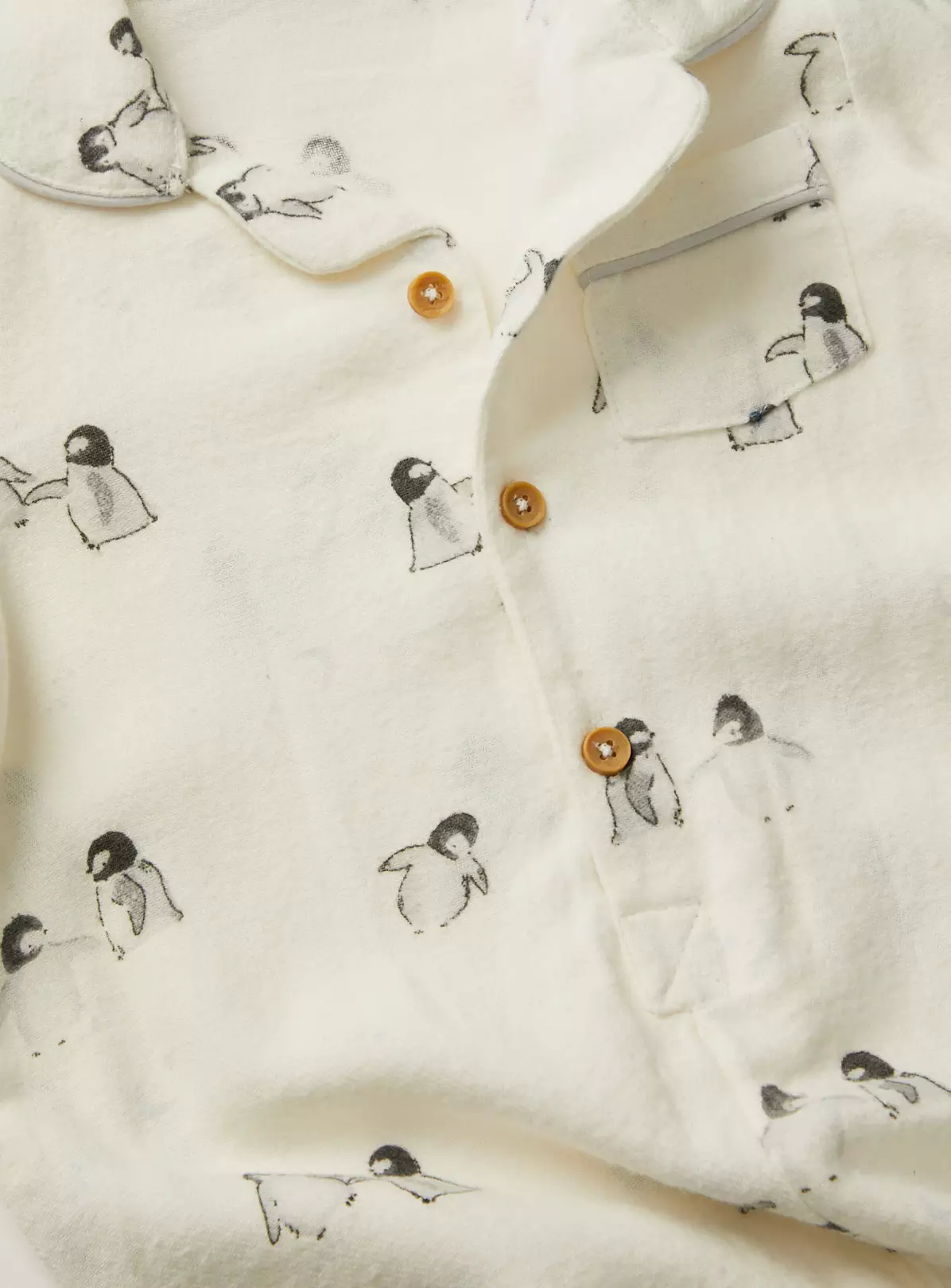 Crafted from cotton, this white romper features an all-over penguin print. In a traditional style, it has value fastenings, a cute collar and front pocket. Perfect for chilly nights!