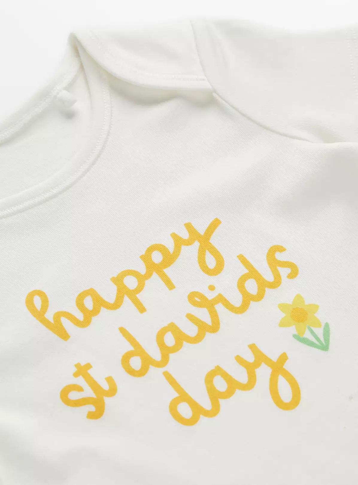 Celebrate St David’s day with our white short sleeve bodysuit! Featuring a ‘Happy St David’s Day’ slogan with a dinky daffodil on the front, it has popper fastening designed for easy and hassle-free changes.
